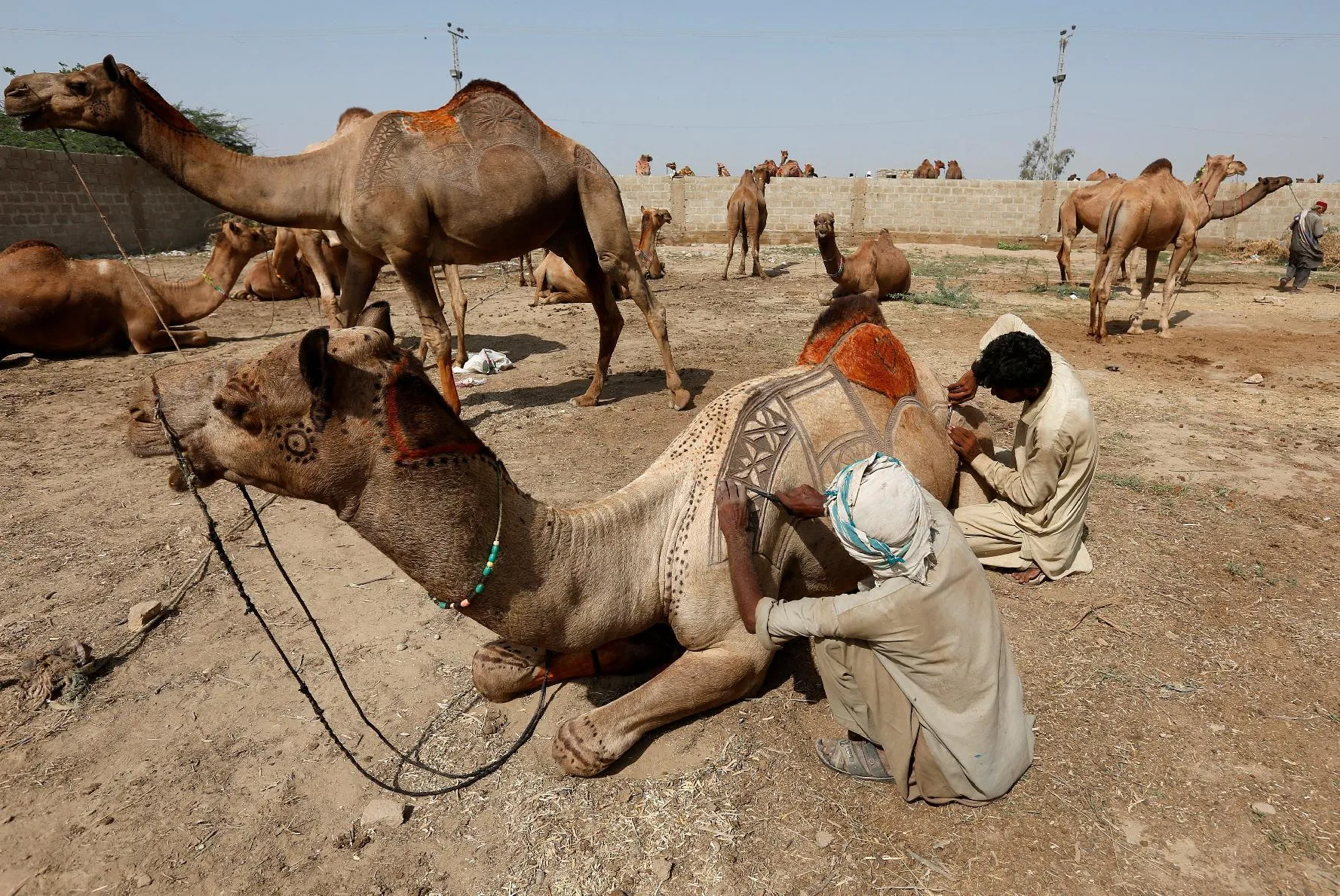 Men use scissors to make intricate decorative patterns on a camel before putting it up for sale at a makeshift cattle market ahead of the Eid al-Adha festival in Karachi, Pakistan September 9, 2016. (Photo by Akhtar Soomro/Reuters)