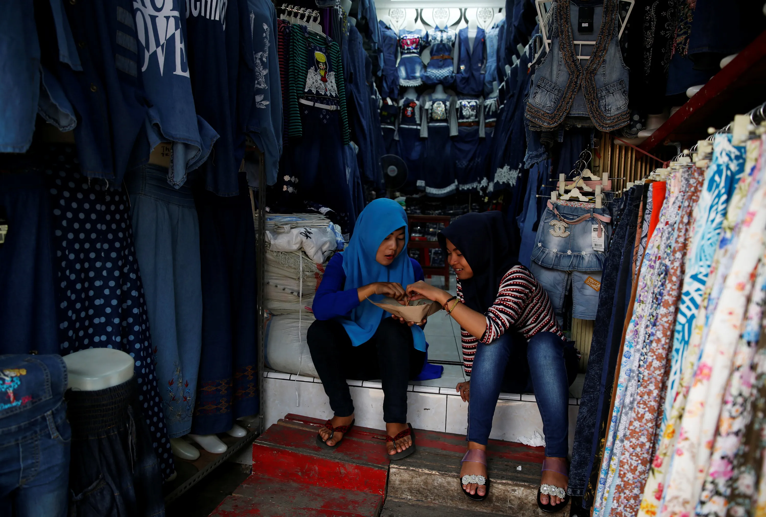 Workers eat fruits at their cloths stall at the Tanah Abang textille market in Jakarta, Indonesia, August 5, 2016. (Photo by Reuters/Beawiharta)