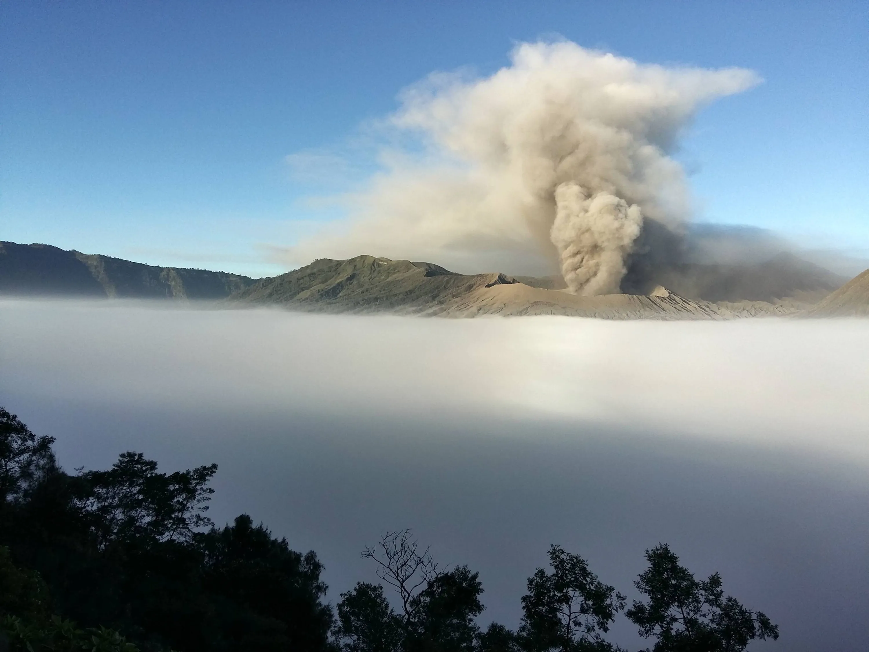 In this photo taken from Probolinggo in Indonesia's East Java province, Mount Bromo spews ashes into the air during a volcanic eruption on July 14, 2016. Mount Bromo lies within Bromo-Tengger-Semeru National Park, a huge caldera containing several volcanoes. (Photo by Bay Ismoyo/AFP Photo)