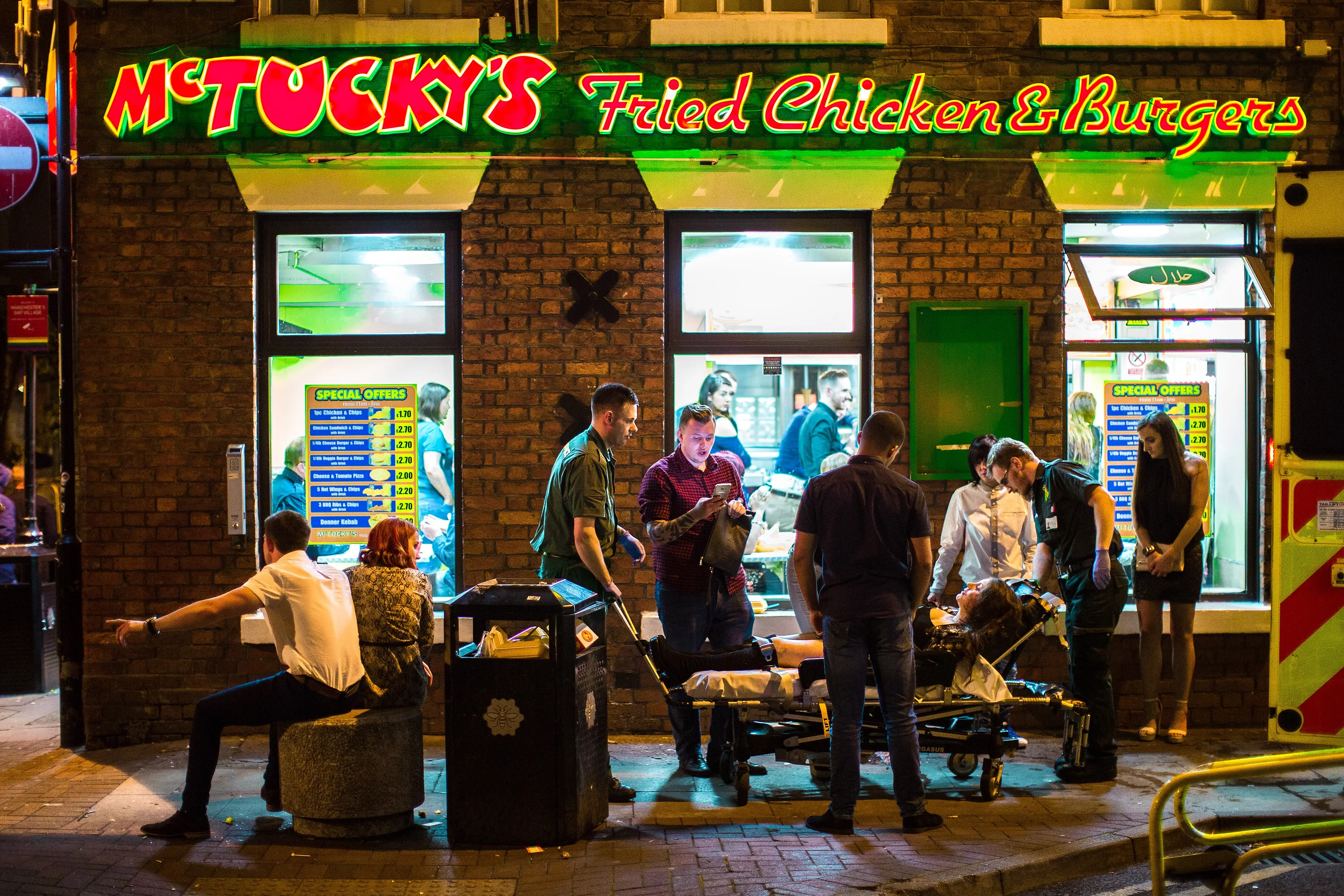 A woman is carried in to an ambulance on a trolley outside McTucky's Fried Chicken and Burgers, in the Gay Village, Manchester, UK on September 11, 2016. (Photo by Joel Goodman/London News Pictures)