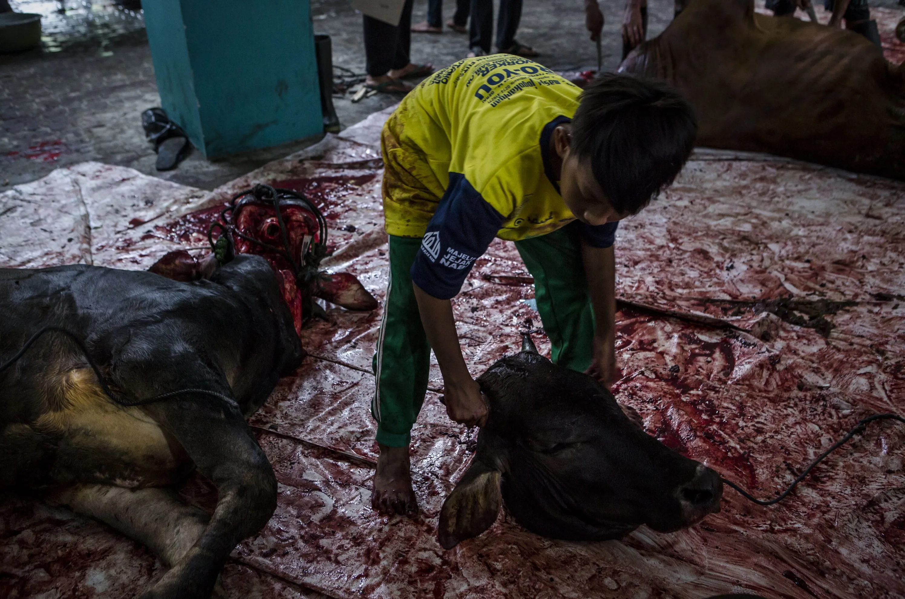 An indonesian Muslim child carries the head of a cow after it was slaughtered during celebrations for Eid al-Adha at Jogokaryan mosque on September 12, 2016 in Yogyakarta, Indonesia. (Photo by Ulet Ifansasti/Getty Images)
