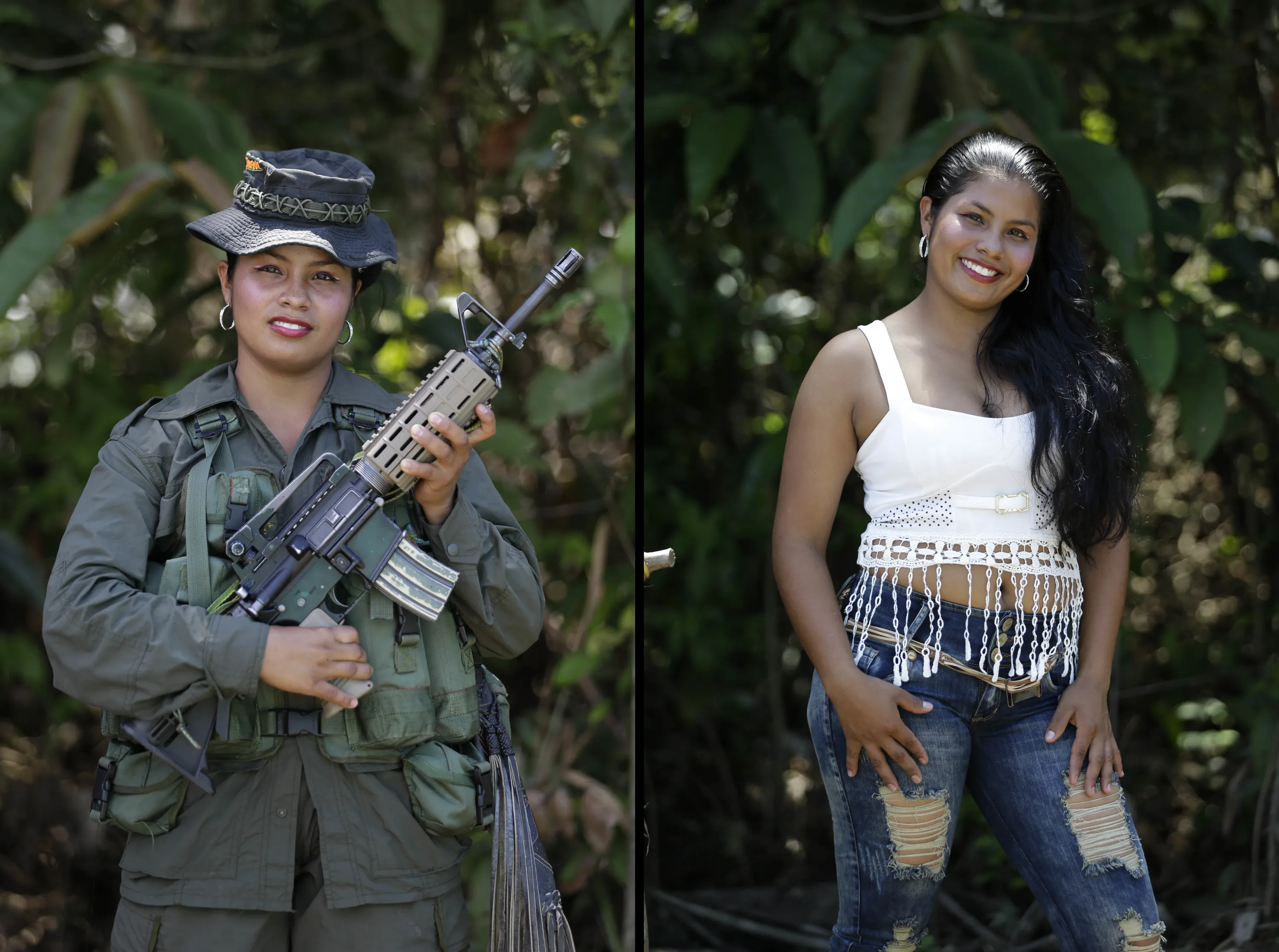 This August 16, 2016 photo shows two portraits of Johana, one of her holding a weapon while in uniform for the 32nd front of the Revolutionary Armed Forces of Colombia (FARC), and in civilian clothing at a guerrilla camp in the southern jungle of Putumayo, Colombia. Johana, 19, said she's spent six years in the FARC and would like to study nursing after demobilizing as part of a peace deal with Colombia's government. (Photo by Fernando Vergara/AP Photo)