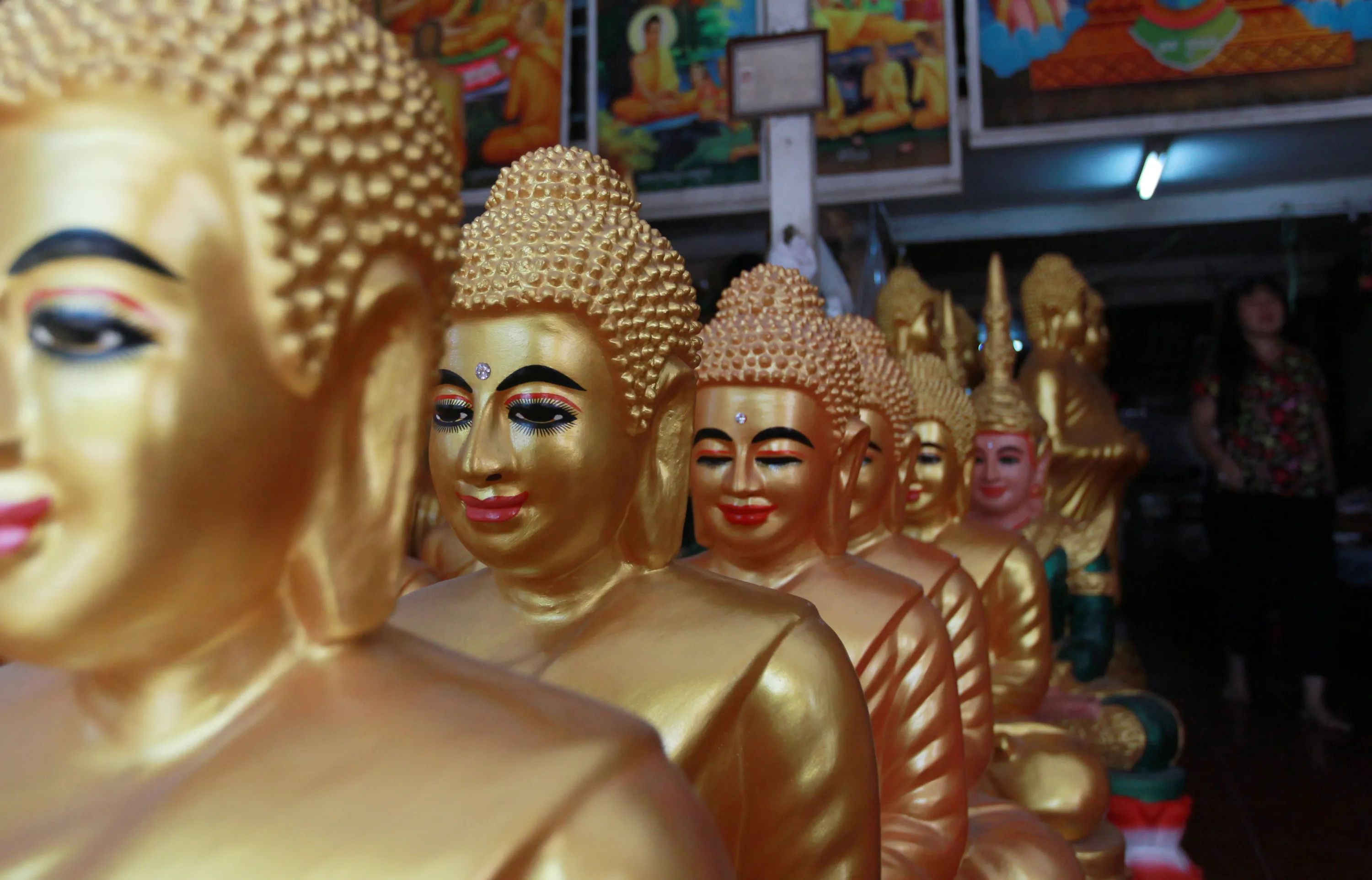 Buddha statues are seen at a shop in front of a pagoda in Phnom Penh, Cambodia, September 12, 2016. (Photo by Samrang Pring/Reuters)