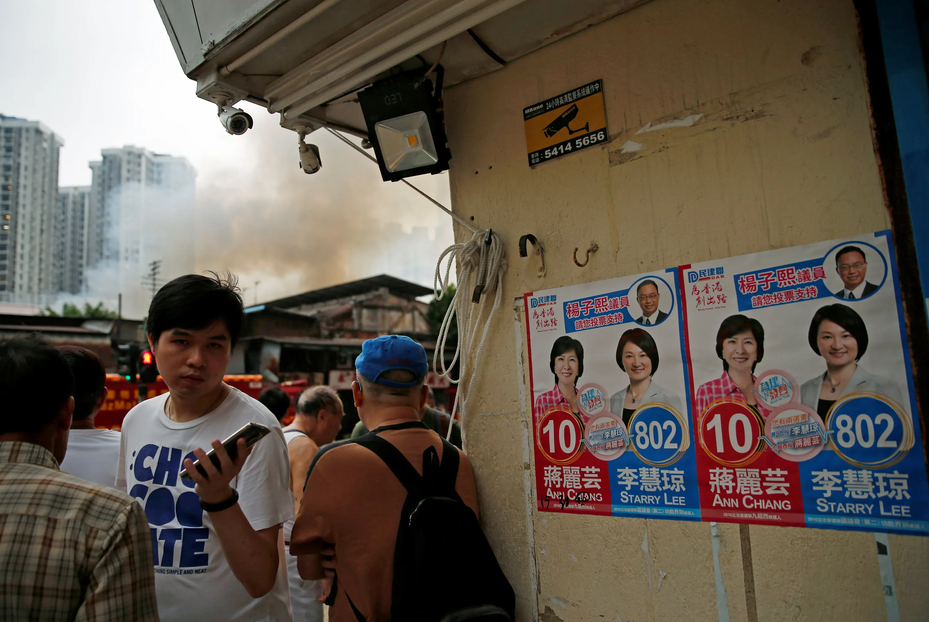 Posters of Ann Chiang (L) and Starry Lee, candidates from Democratic Alliance for the Betterment and Progress of Hong Kong are seen next to Yau Ma Tei Wholesale Fruit Market while smoke billows from the fire, on election day for the Legislative Council in Hong Kong, China September 4, 2016. (Photo by Tyrone Siu/Reuters)