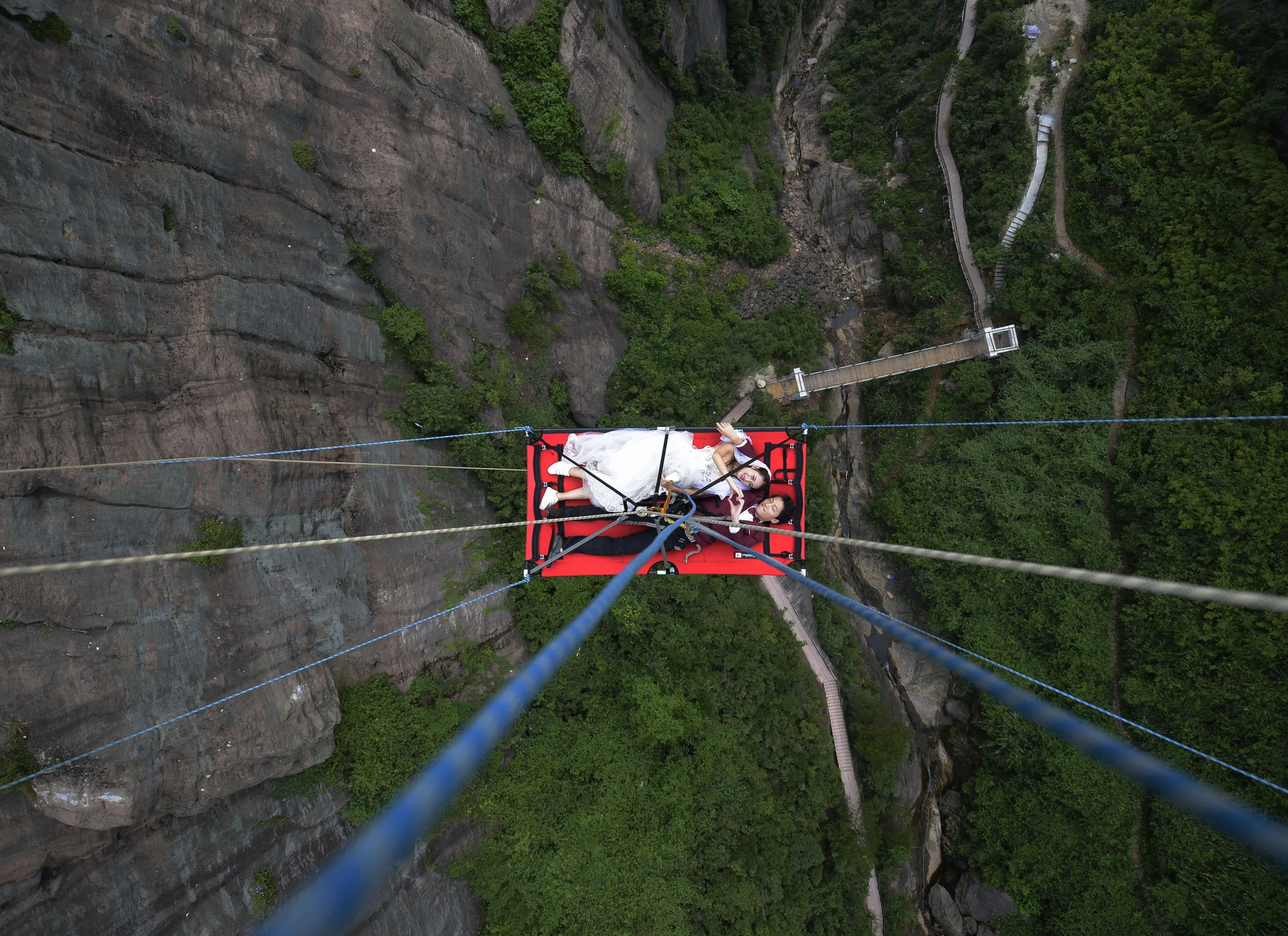 A pair of newlyweds hold their wedding suspended from a glass-bottomed suspension bridge 180 meters above a valley at Shiniuzhai National Geopark in Pingjiang County on August 9, 2016 in Yueyang, Hunan Province of China. (Photo by VCG/VCG via Getty Images)