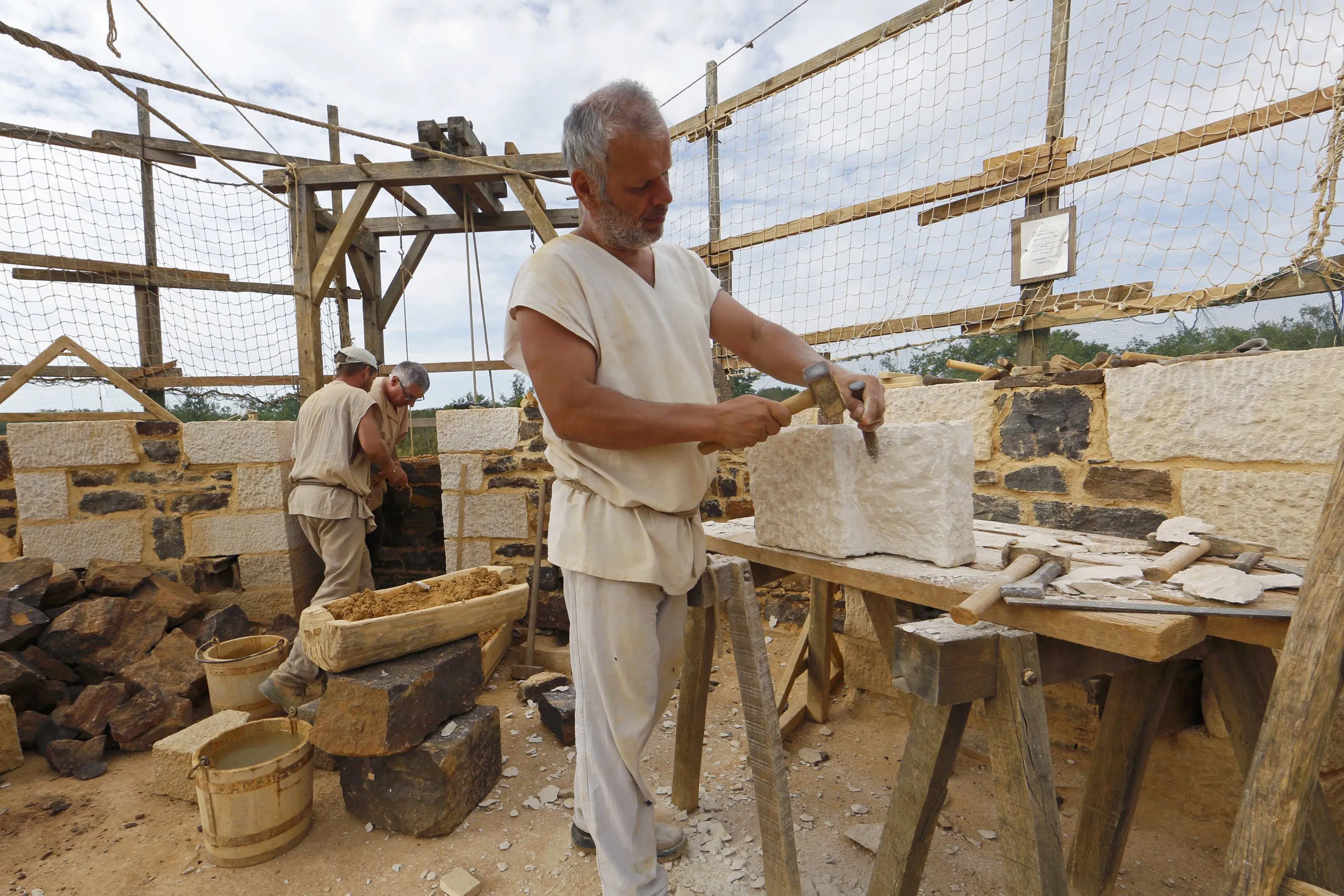 Stonecutter and massons work at the construction site of the Chateau de Guedelon near Treigny in the Burgundy region of France, September 13, 2016. (Photo by Jacky Naegelen/Reuters)