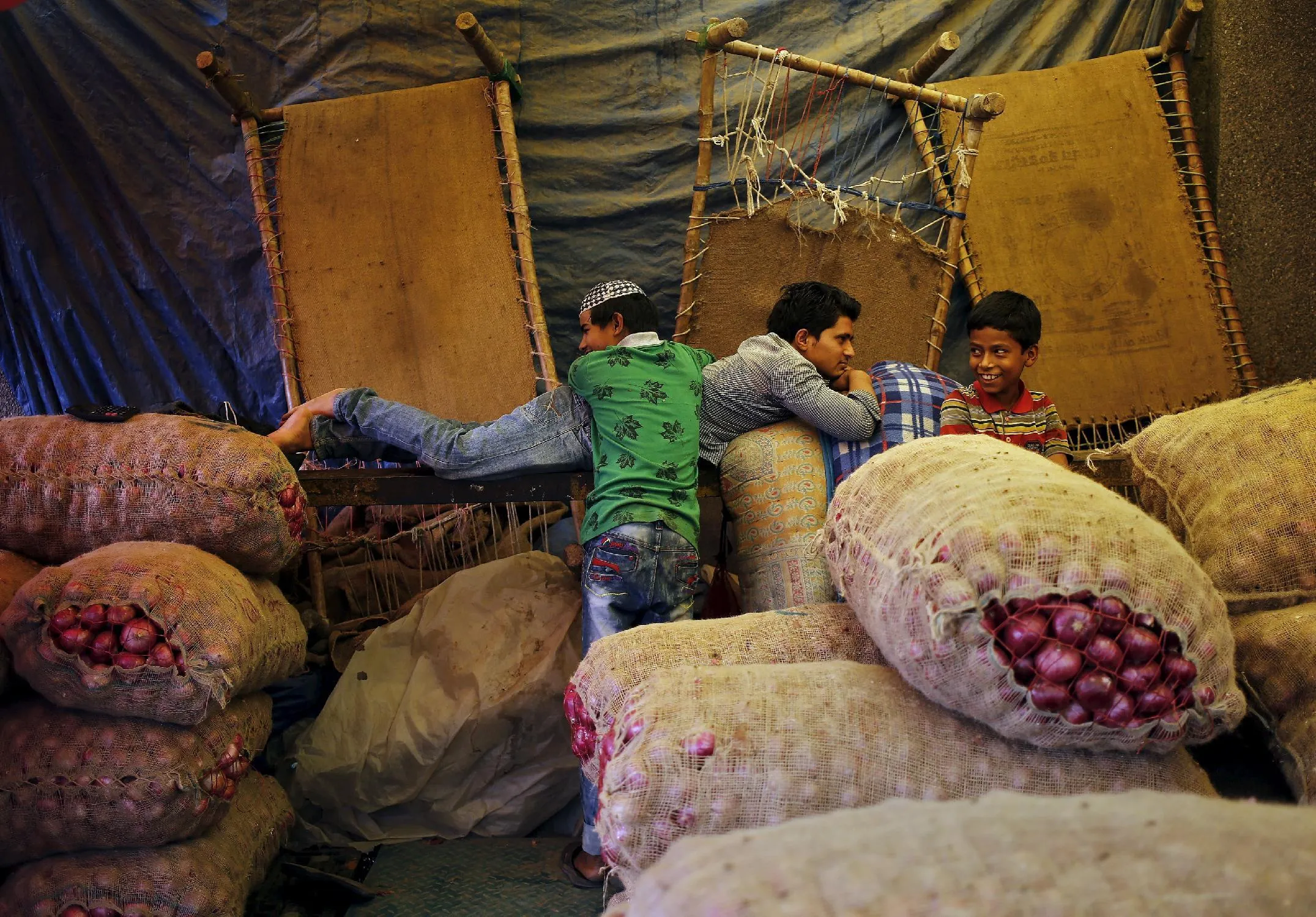 People rest next to stacked sacks of onions at a wholesale vegetable market in New Delhi, India, October 14, 2015. (Photo by Anindito Mukherjee/Reuters)