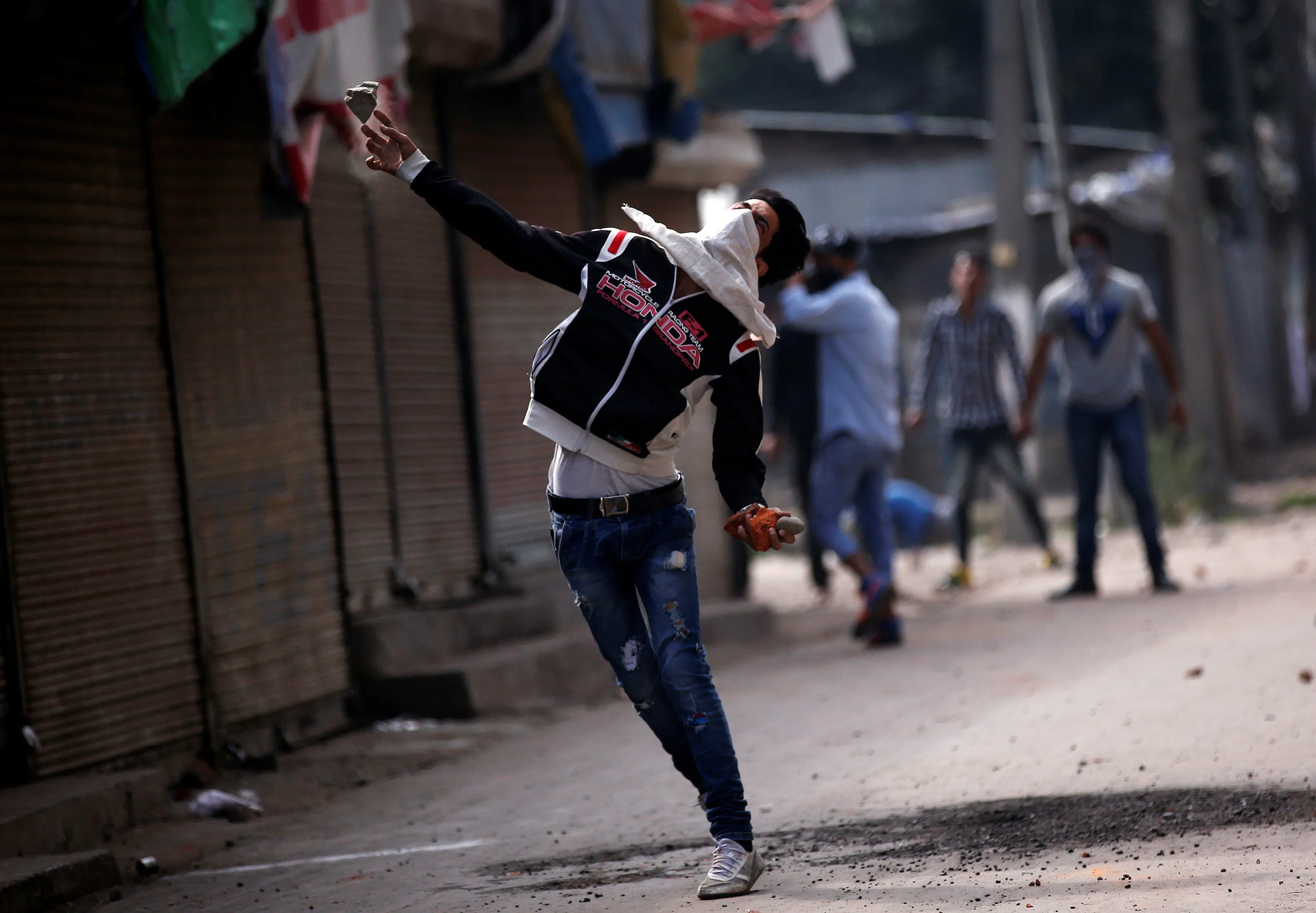 A protester throws a stone towards Indian police during a protest against the recent killings in Kashmir, in Srinagar September 13, 2016. (Photo by Danish Ismail/Reuters)