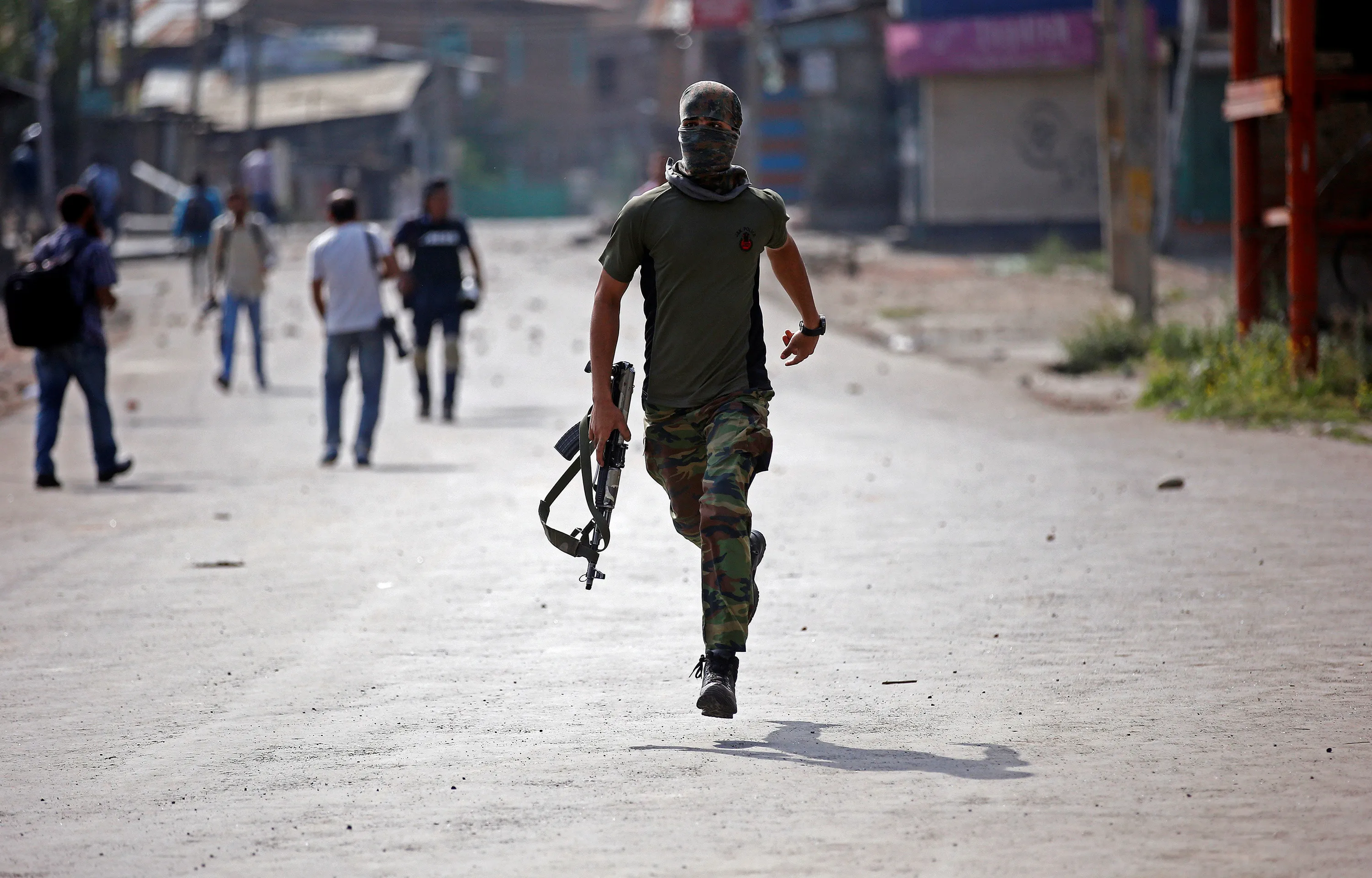 An Indian policeman runs during a protest against the recent killings in Kashmir, in Srinagar September 13, 2016. (Photo by Danish Ismail/Reuters)