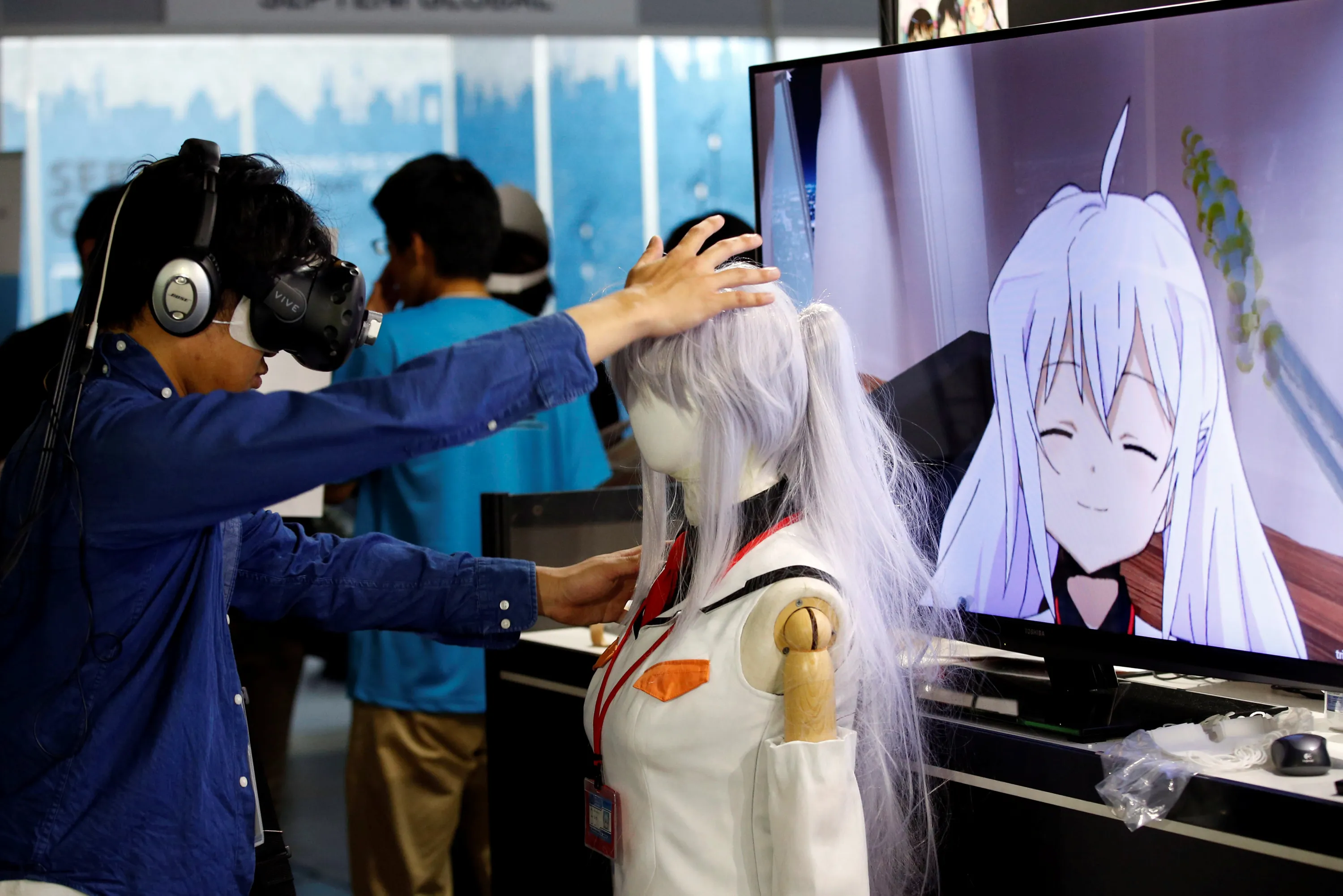 A man touches a mannequin as he tries out a M2 Co.Ltd's “E-mote” system as the monitor shows the image from the VR device at Tokyo Game Show 2016 in Chiba, east of Tokyo, Japan, September 15, 2016. (Photo by Kim Kyung-Hoon/Reuters)
