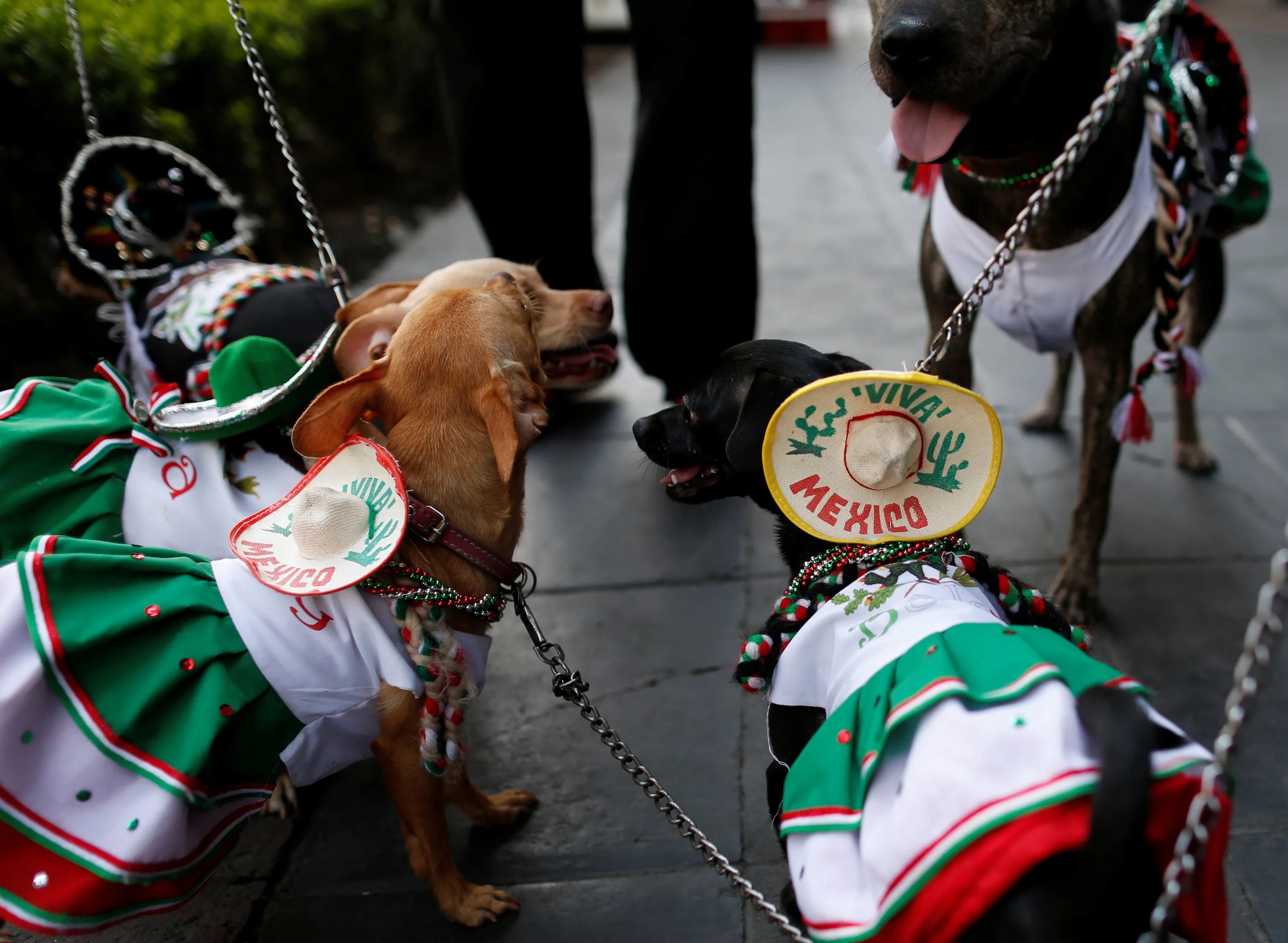 Dogs in traditional outfits are pictured near the Zocalo square, before the “Cry of Independence” ceremony to mark the 206th anniversary of the day rebel priest Manuel Hidalgo set the path to independence in Mexico City, Mexico September 15, 2016. (Photo by Carlos Jasso/Reuters)