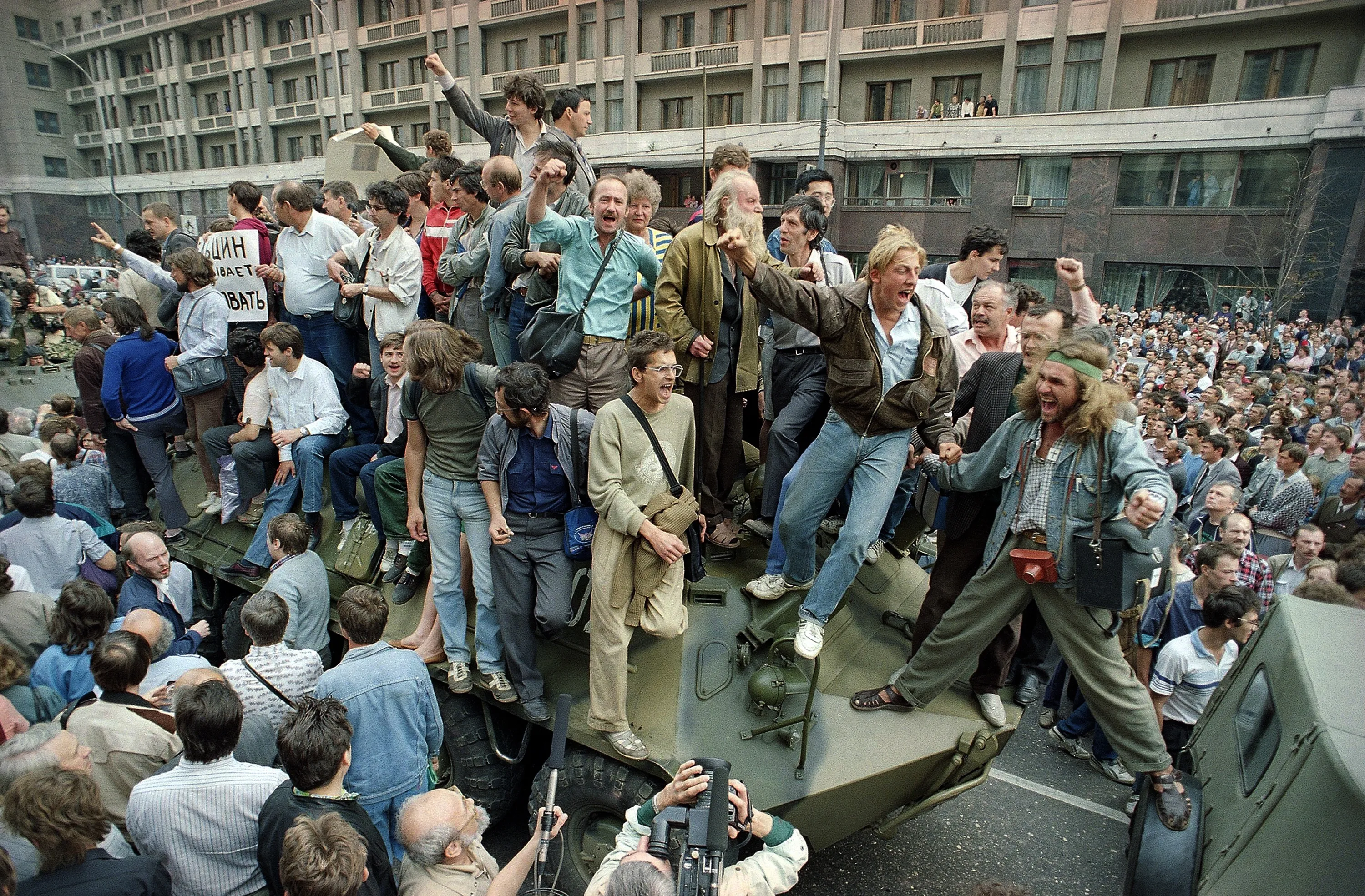 In this August 19, 1991 file photo, crowds of people surround and climb on tanks which were stopped by the crowd as they drove towards the Red Square area of Moscow, Russia, during a military coup after the announced ousting of Mikhail Gorbachev from power. In these critical days when Muscovites turned out to defend the spirit of democracy that Gorbachev had unleashed, and many Soviet officers defied their orders and sided with the people, ensuring that that the plotters failed. (Photo by Boris Yurchenko/AP Photo)