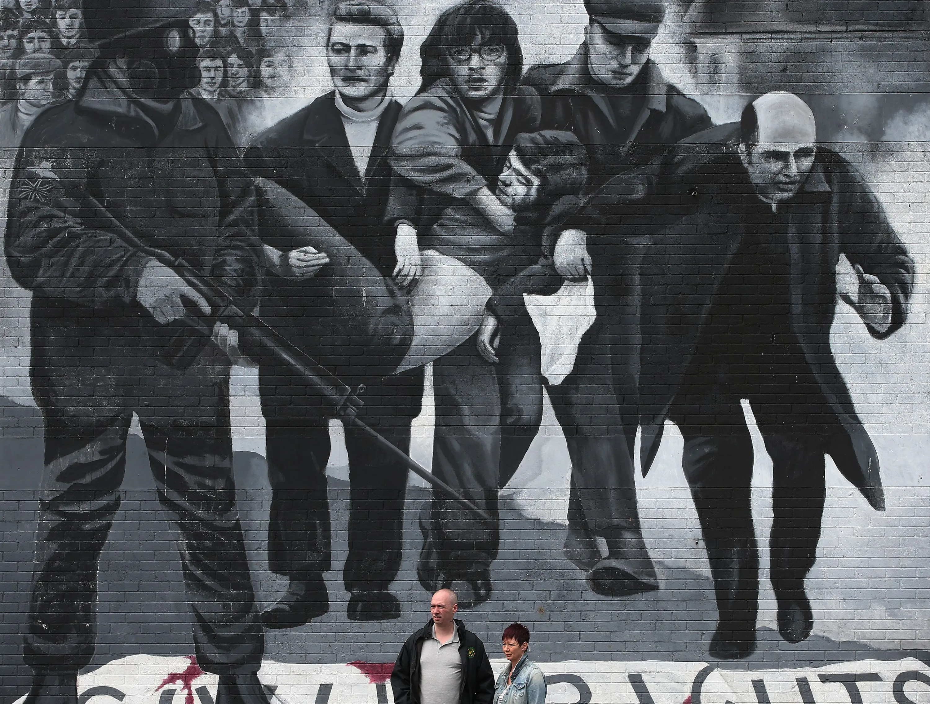A mural in the Bogside area, Derry, Northern Irleand depicting Dr Edward Daly waving a blood-soaked handkerchief as he helped lead fatally injured civil rights protestor Jackie Duddy away from gunfire on Bloody Sunday in January 1972. Daly died on Monday, August 8, 2016. (Photo by Brian Lawless/PA Wire)