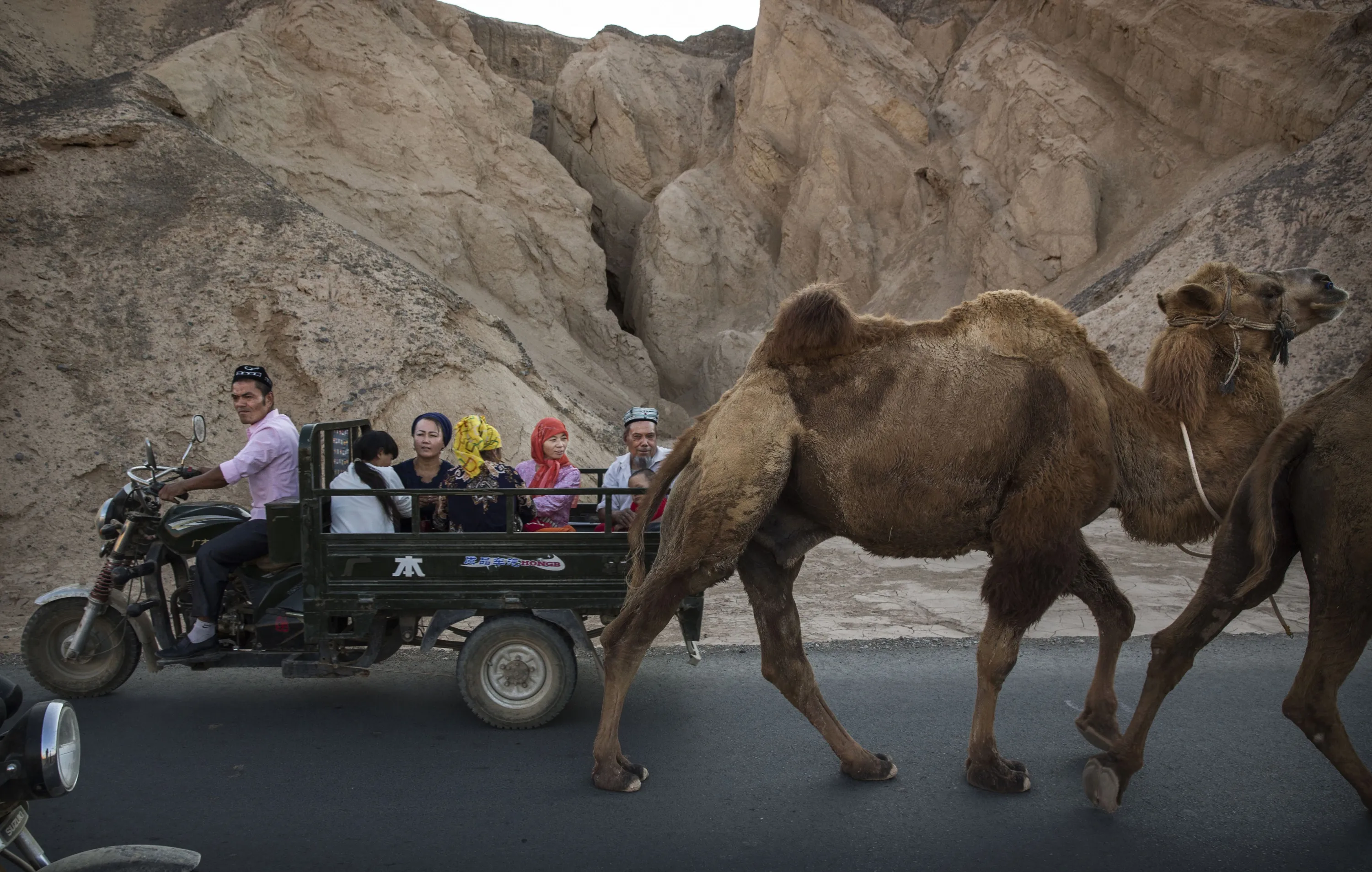 A Uyghur family ride passed a camel on a road during the Corban Festival on September 12, 2016 in Turpan County, in the far western Xinjiang province, China. The Corban festival, known to Muslims worldwide as Eid al-Adha or 'feast of the sacrifice', is celebrated by ethnic Uyghurs across Xinjiang, the far-western region of China bordering Central Asia that is home to roughly half of the country's 23 million Muslims. The festival, considered the most important of the year, involves religious rites and visits to the graves of relatives, as well as sharing meals with family. Although Islam is a 'recognized' religion in the constitution of officially atheist China, ethnic Uyghurs are subjected to restrictions on religious and cultural practices that are imposed by China's Communist Party. Ethnic tensions have fueled violence that Chinese authorities point to as justification for the restrictions. (Photo by Kevin Frayer/Getty Images)