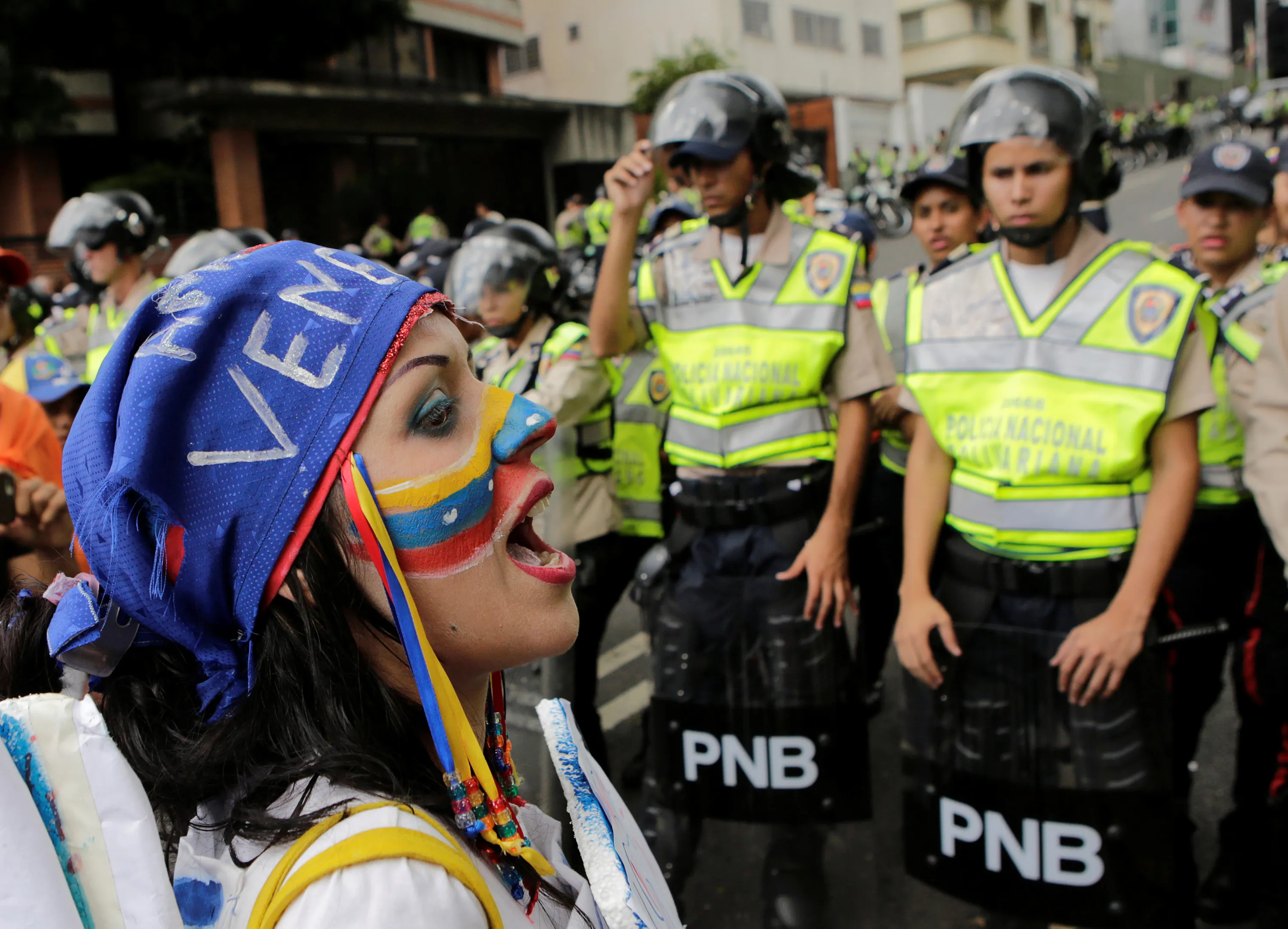 A supporter of Venezuela's opposition faces police officers who are blocking a street, as she takes part in a rally to demand a referendum to remove Venezuela's President Nicolas Maduro, in Caracas, Venezuela, September 16, 2016. (Photo by Henry Romero/Reuters)