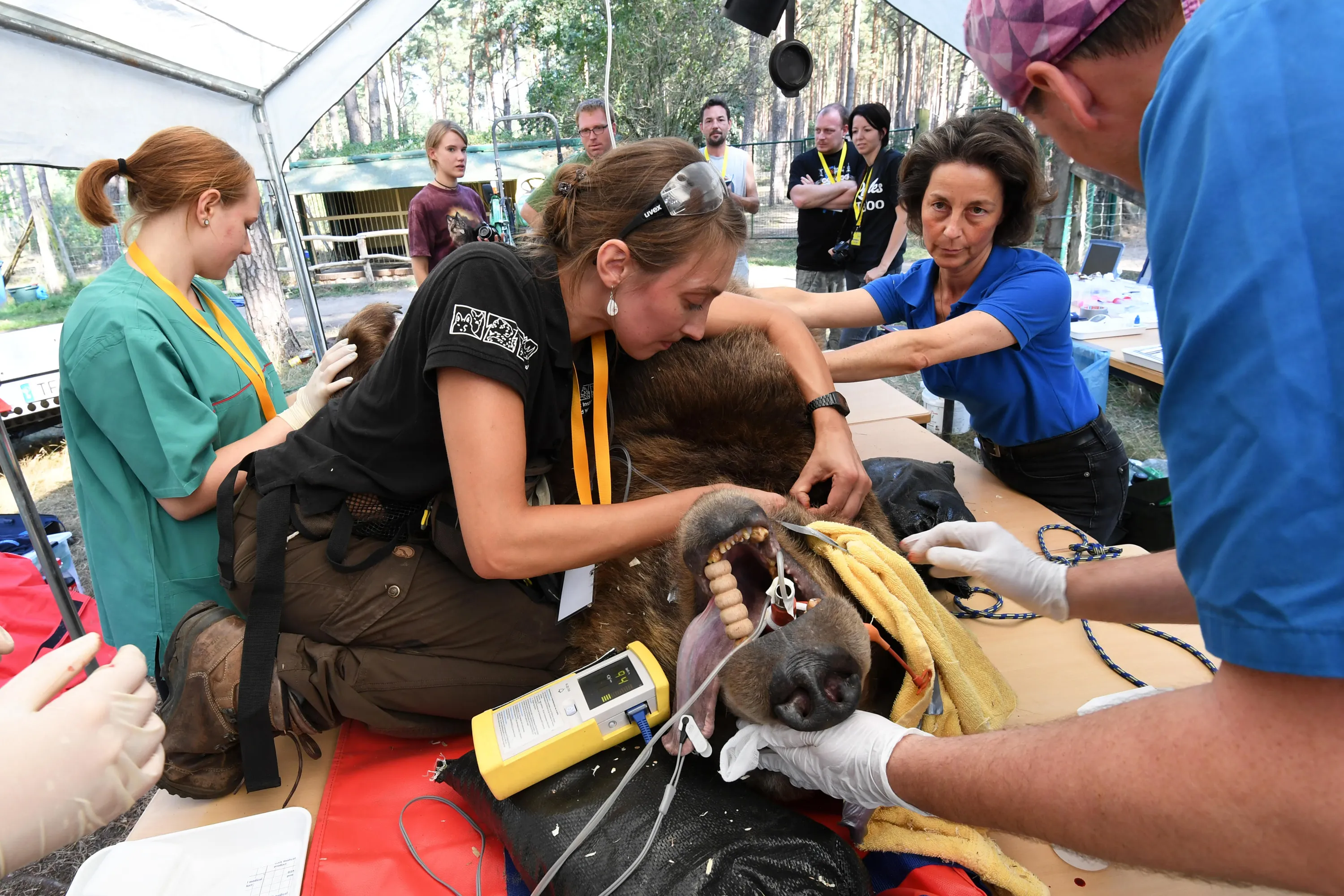 The teeth of narcotized brown bear Igor are examined by specialists in a field hospital at wild park Johannismuhle near Baruth, Germany, 16 September 2016. Vets of the Leipnitz-Institute for zoo and wild animal research and teeth specialists want to operate on a back tooth of the more than 250-kilogramme-heavy bear. (Photo by Ralf Hirschberger/DPA/Alamy Live News)