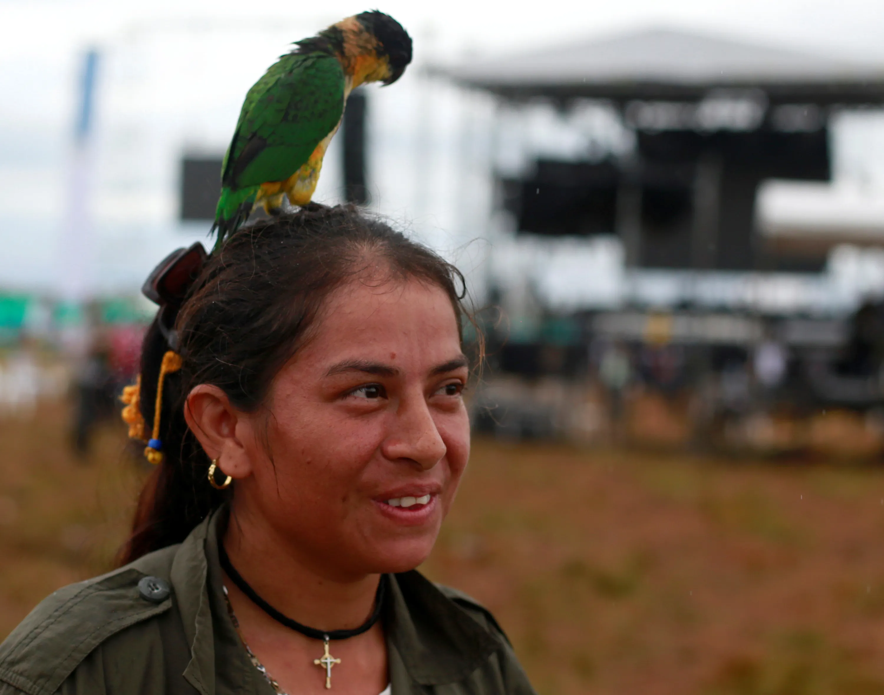 A fighter from Revolutionary Armed Forces of Colombia (FARC), is seen with her parrot after the opening of ceremony congress at the camp where they prepare for ratifying a peace deal with the government, near El Diamante in Yari Plains, Colombia, September 17, 2016. (Photo by John Vizcaino/Reuters)