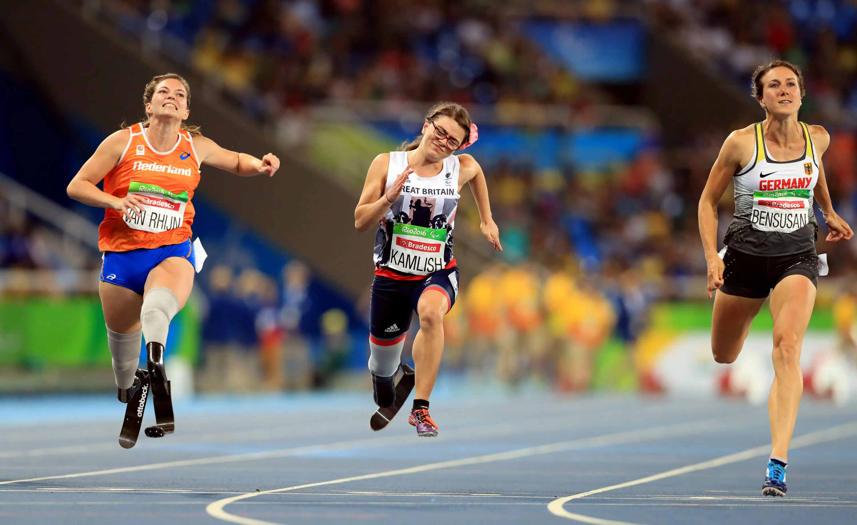Marlou Van Rhijn (L) of the Netherlands finishes first in the Women's 100m – T44 Final during the Athletics competition at the Olympic Stadium during the Paralympic Games, Rio de Janeiro, Brazil, Saturday 17 September 2016. (Photo by Adam Davy/PA Wire)
