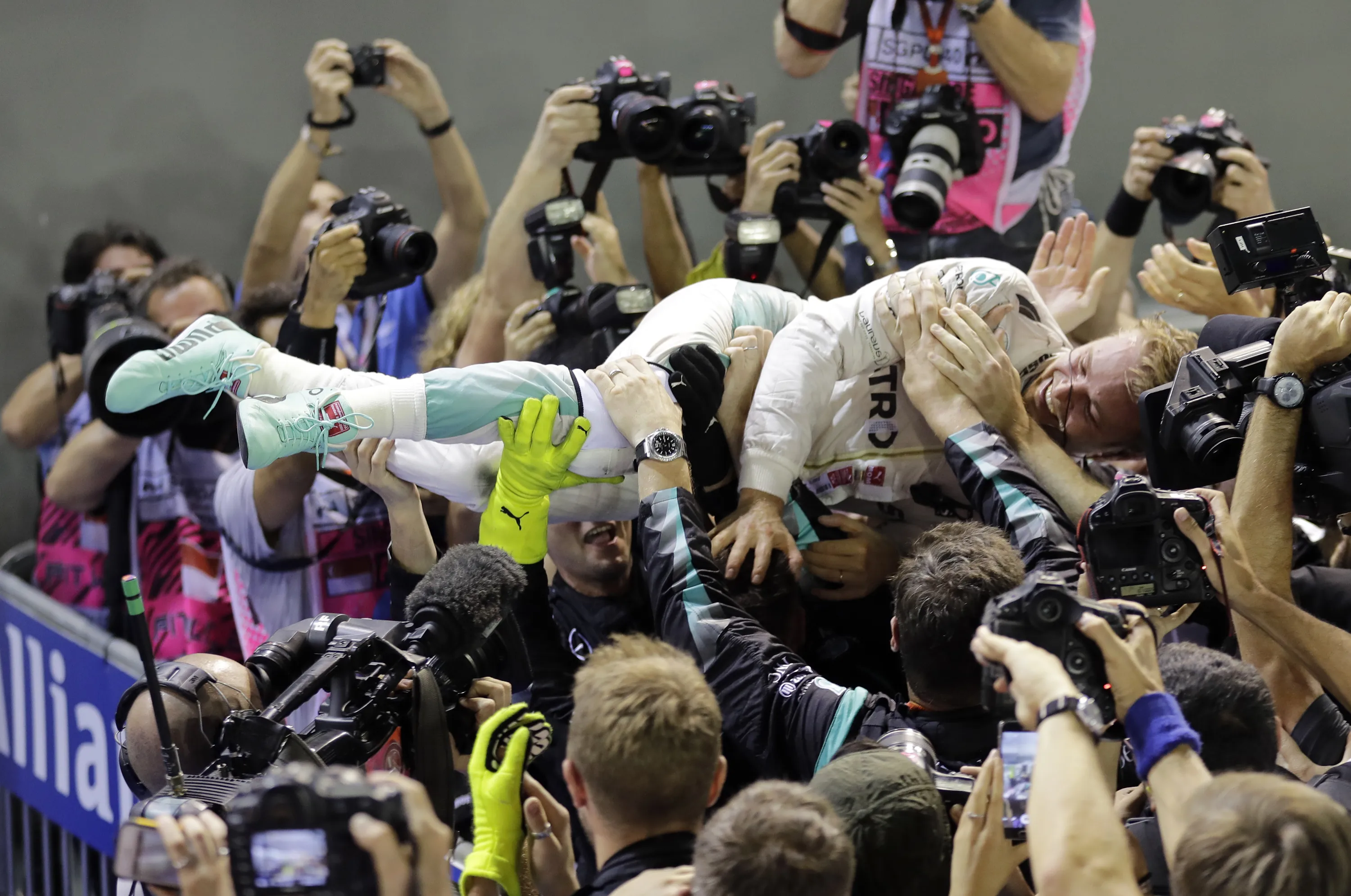 Mercedes driver Nico Rosberg of Germany is embraced by his team after winning the Singapore Formula One Grand Prix on the Marina Bay City Circuit Singapore, Sunday, September 18, 2016. (Photo by Wong Maye-E/AP Photo)