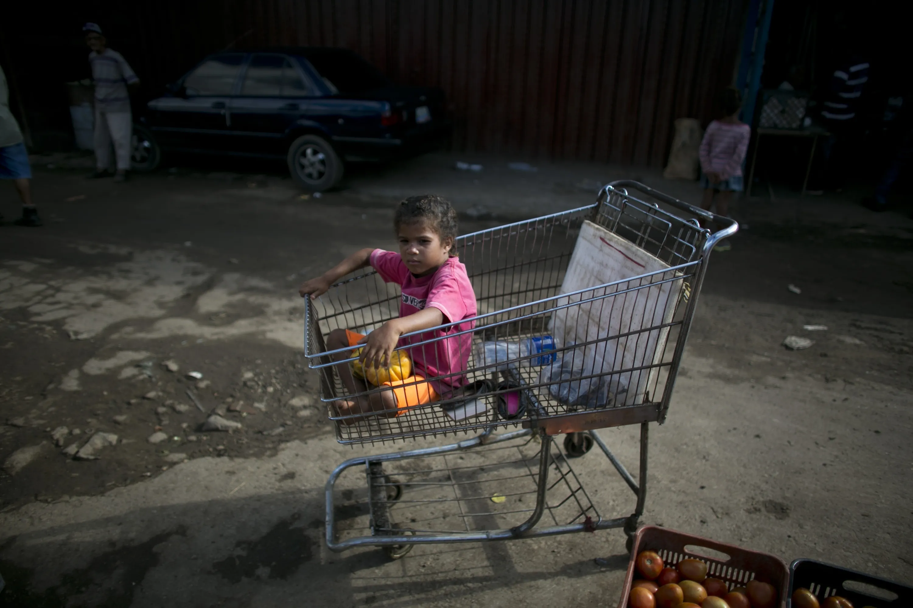 In this September 12, 2016 photo, a girl sits in a supermarket cart as she waits for her dad at the market he works at in Porlamar, Venezuela. The child's father Alexander Velasquez spent the afternoon asking for food donations from vendors at Conejero market where he works as a porter. (Photo by Ariana Cubillos/AP Photo)