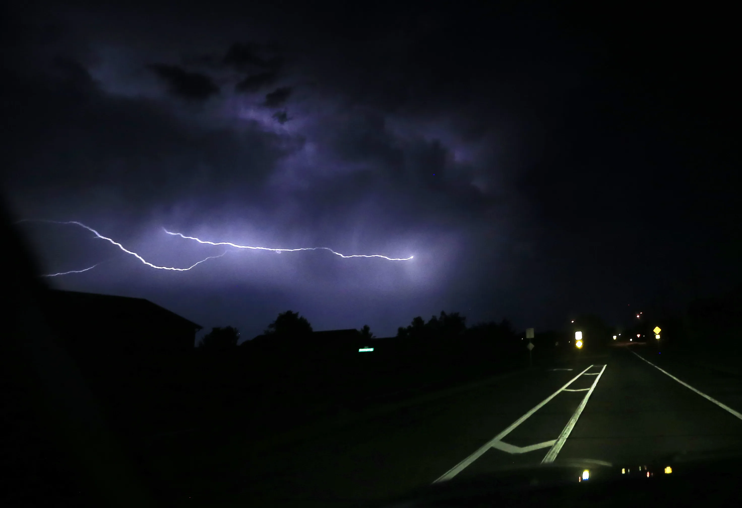 Lightning strikes cloud-to-cloud along a county road near Lawrence, Kan., Thursday, May 26, 2016. Severe storms that produced at least one tornado moved through the area overnight. (Photo by Orlin Wagner/AP Photo)