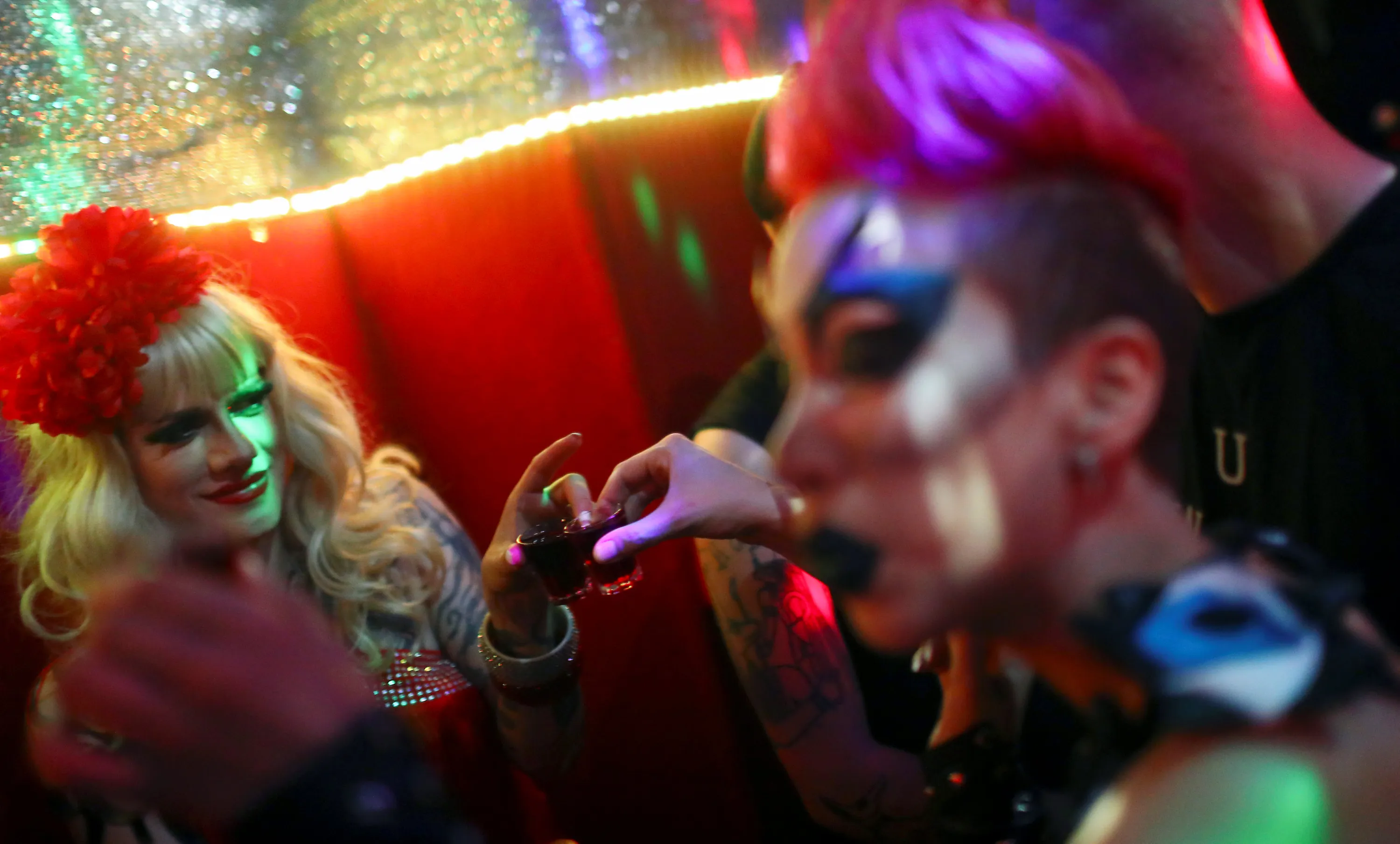 People toast during an after-show party for drag queens and kings in Berlin, Germany, August 27, 2016. Rauschgold, a colourful and crowded place, is famous for its themed parties. (Photo by Hannibal Hanschke/Reuters)