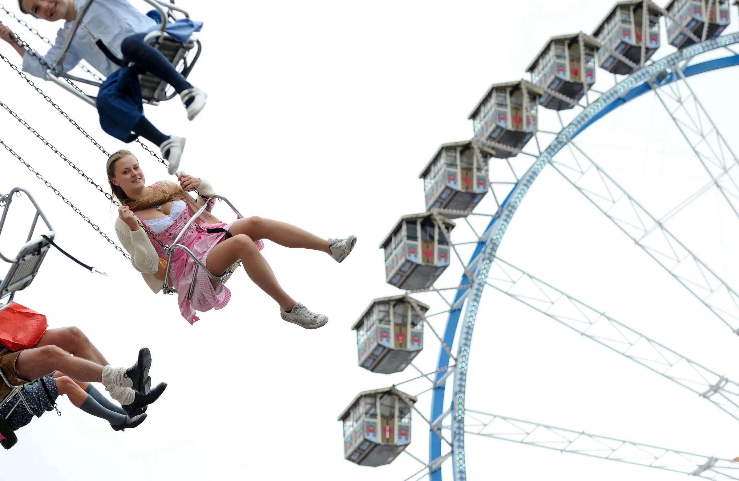 Visitors enjoy a ride on a carosel at the Oktoberfest beer festival in Munich, Germany, 18 September 2016. The 183rd edition of the annual folk and beer festival runs from 17 September to 03 October and is expected to attract once more several millions of visitors from all over the world. (Photo by Andreas Gebert/EPA)