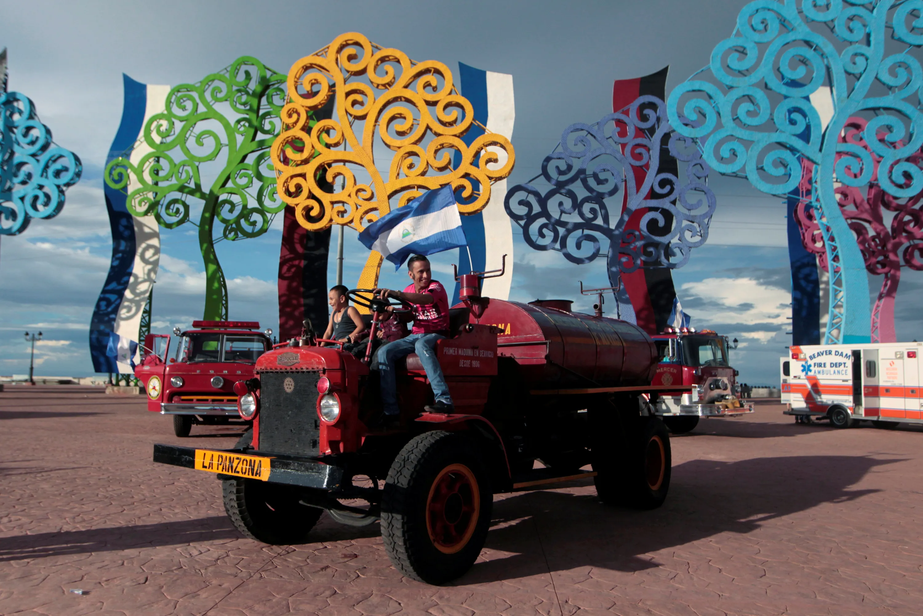 A man poses for pictures on a fire truck during an exhibition of old fire trucks in Managua, Nicaragua September 18, 2016. (Photo by Oswaldo Rivas/Reuters)