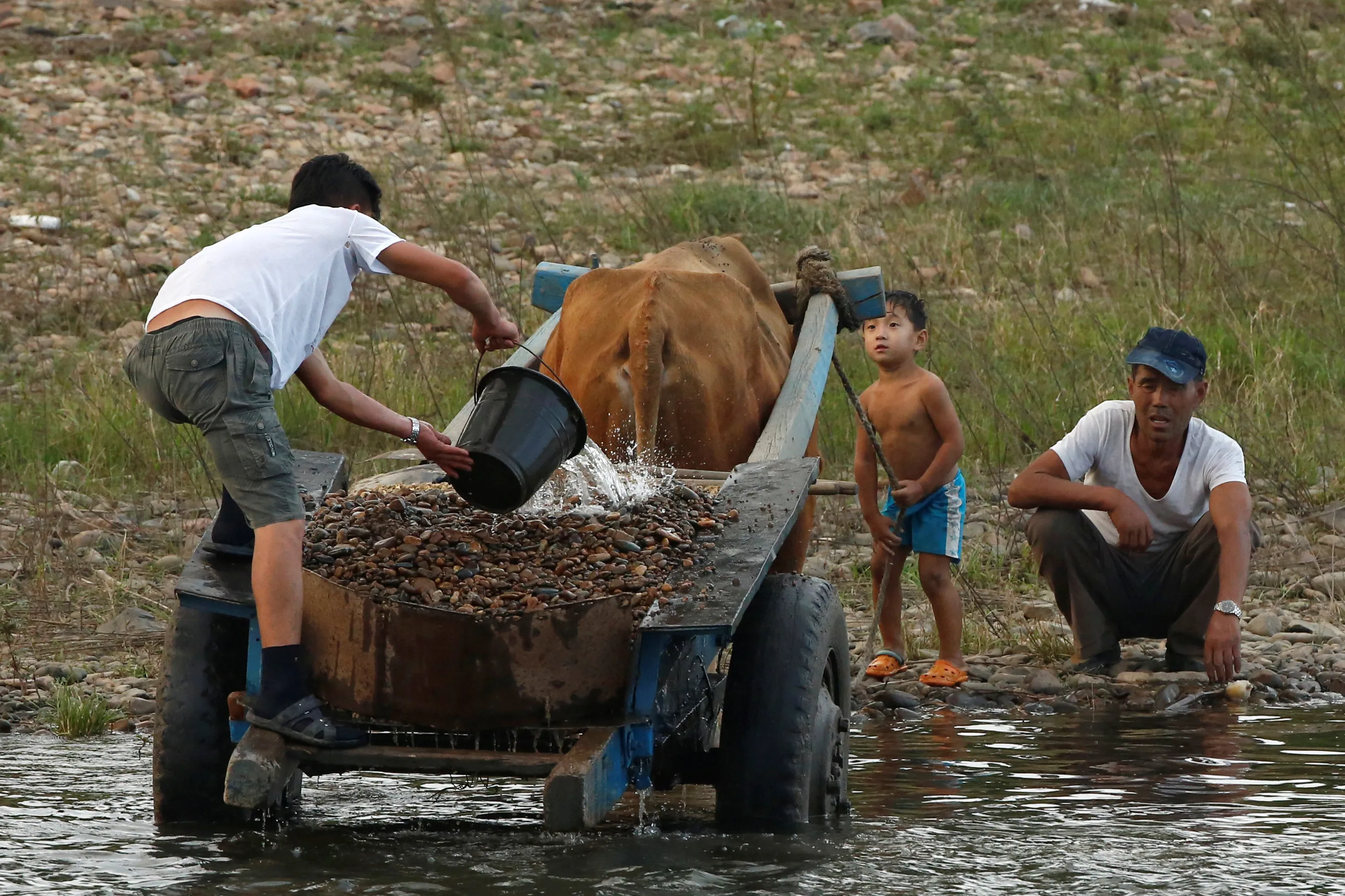 A man pours water onto a cart of an ox-wagon at the bank of the Yalu River, outside the North Korean town of Sinuiju, opposite Dandong in China's Liaoning province, September 11, 2016. (Photo by Thomas Peter/Reuters)