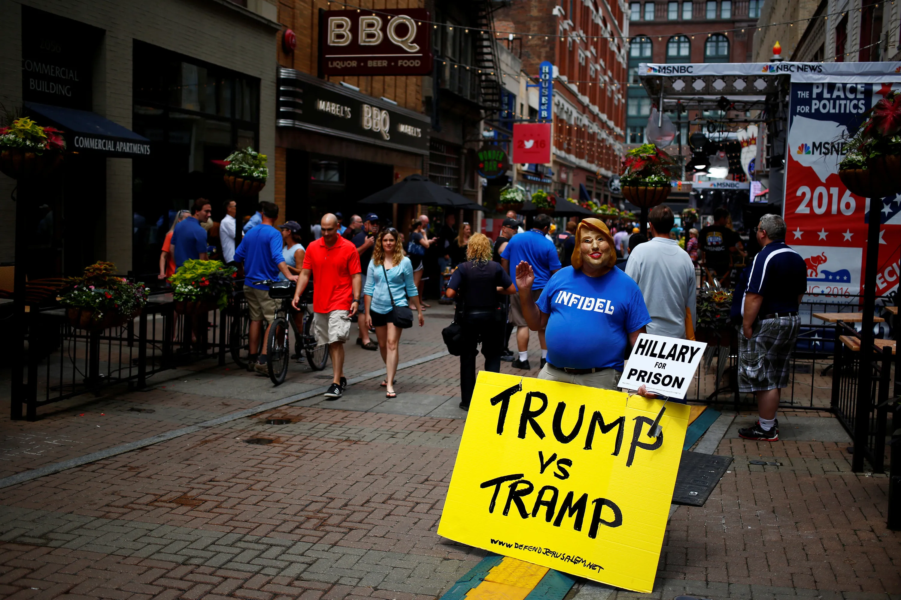A protestor stands across from Quicken Loans Arena as setup continues in advance of the Republican National Convention in Cleveland, Ohio, U.S., July 16, 2016. (Photo by Aaron P. Bernstein/Reuters)