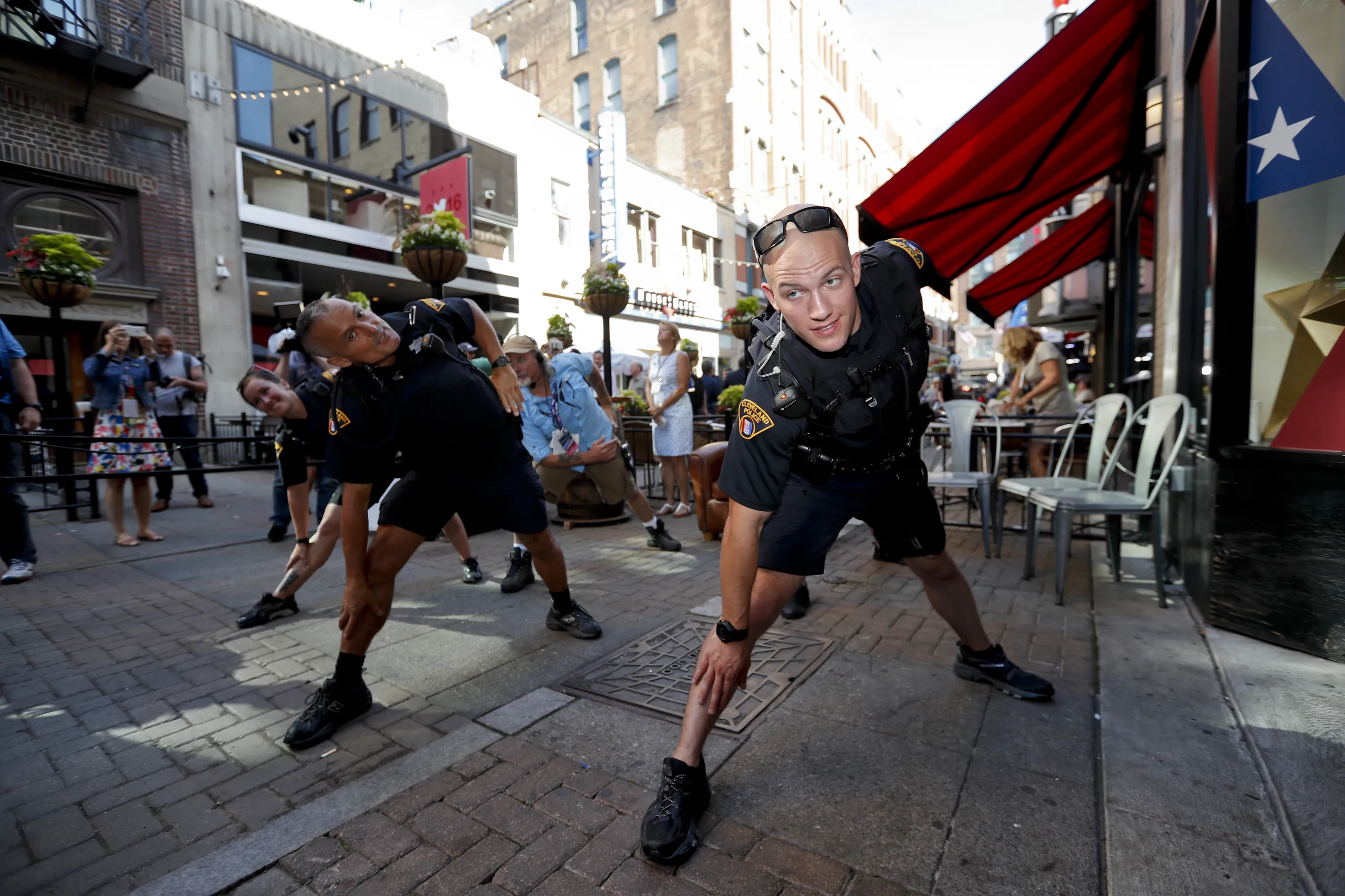 Police officers stretch and warm up before going on patrol, Wednesday, July 20, 2016, in Cleveland, during the third day of the Republican convention. (Photo by Alex Brandon/AP Photo)