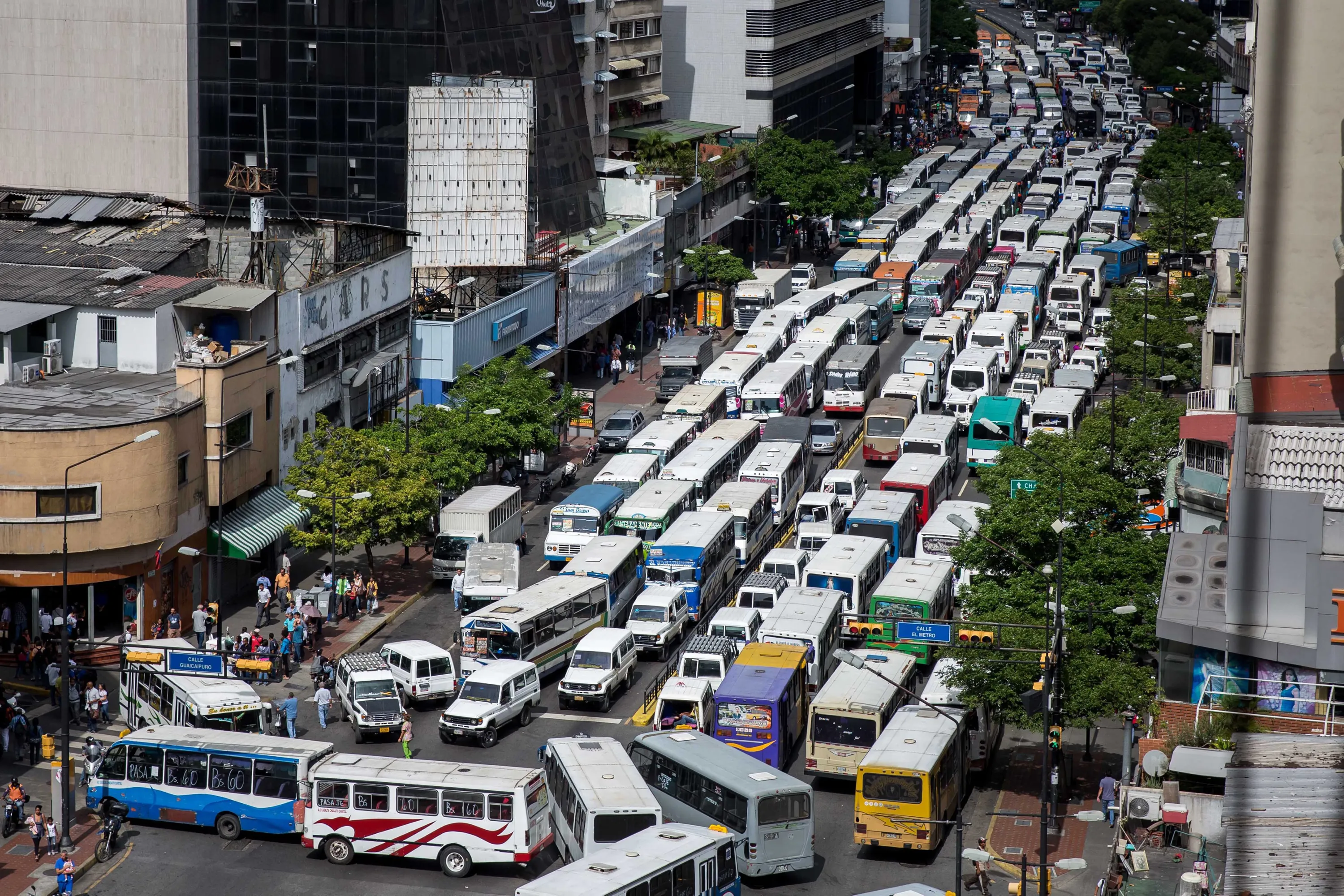 General view of a street blocked by public buses during a bus drivers' protest in Caracas, Venezuela, 21 September 2016. The drivers protested against the lack of parts and the increase of fare rates. (Photo by Miguel Gutierrez/EPA)