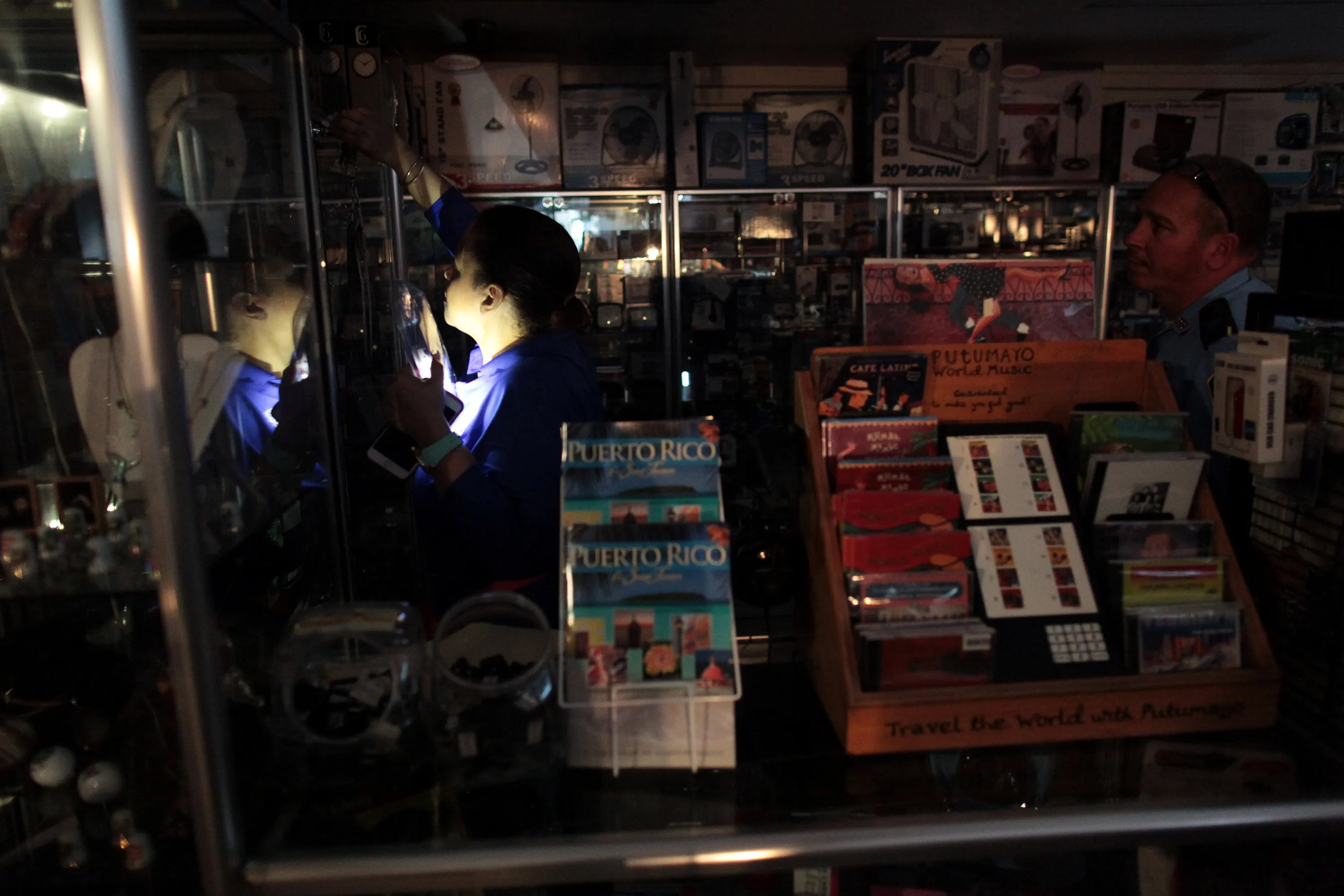 The employee of a drug store attends to a client during a power outage after a fire at an energy plant knocked out electricity for the bulk of the island, in San Juan, Puerto Rico, September 22, 2016. (Photo by Alvin Baez/Reuters)