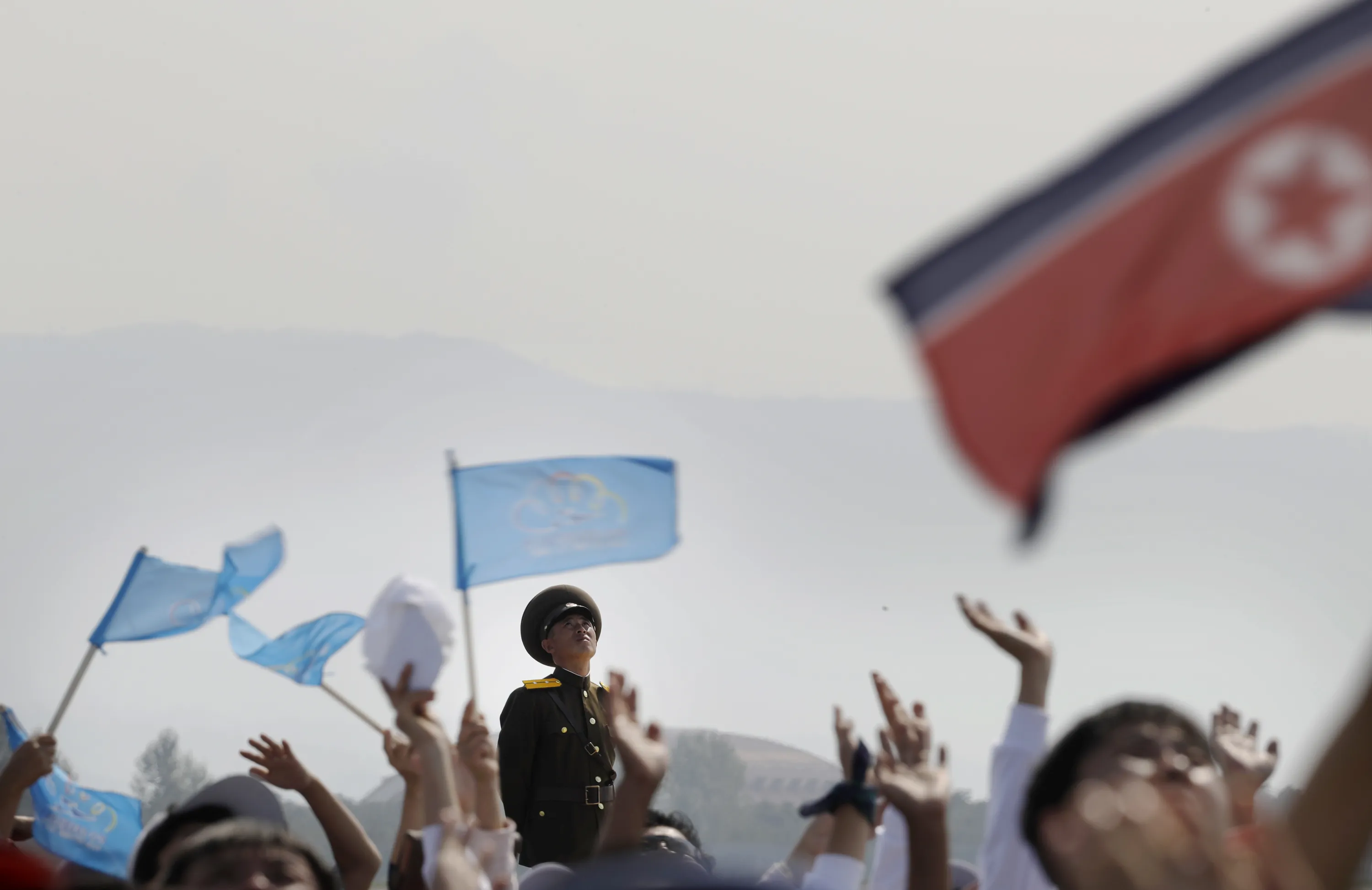 A North Korean military soldier stands guard as North Koreans wave flags and cheer during an aerial display on Saturday, September 24, 2016, in Wonsan, North Korea. (Photo by Wong Maye-E/AP Photo)