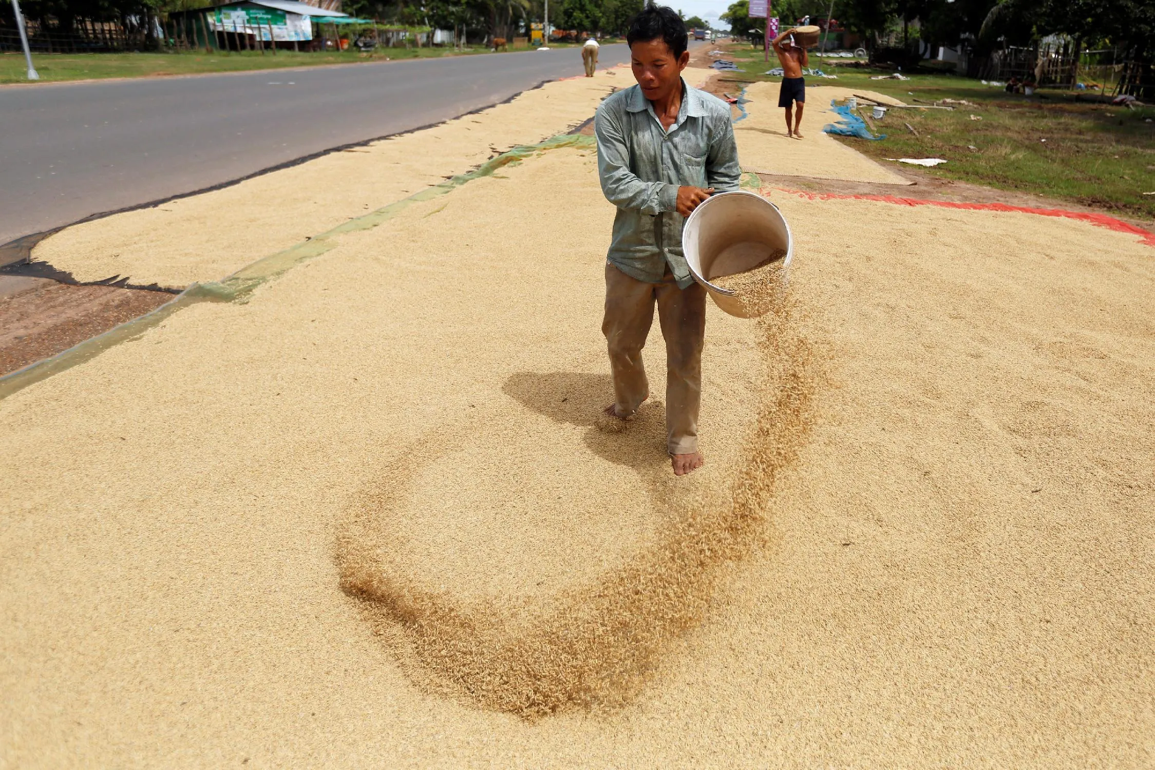 Men dry unhusked rice on a road in front of their home in Kampong Thom province, Cambodia, September 24, 2016. (Photo by Samrang Pring/Reuters)