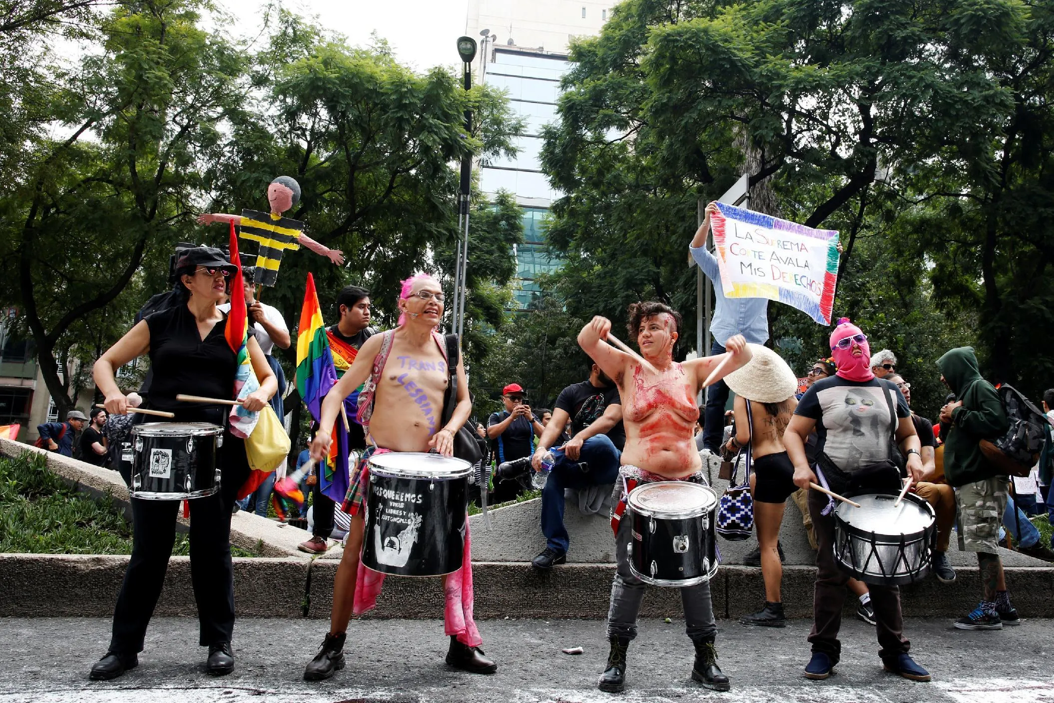 Participants play the drums at the Angel of Independence monument in support for the legalization of gay marriage while others protest against it and defend their interpretation of traditional family values, in Mexico City, Mexico September 24, 2016. (Photo by Carlos Jasso/Reuters)