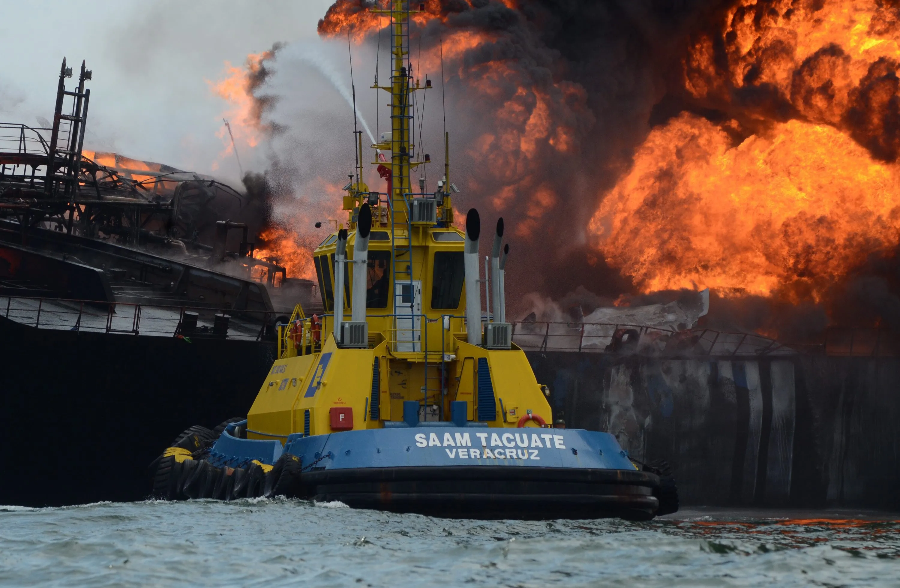 Smoke rises from the ship “Burgos” owned by state-run company Pemex, where an explosion occured, close to coast of the port of Veracruz, Mexico, 24 September 2016. (Photo by Luis Monroy/EPA)