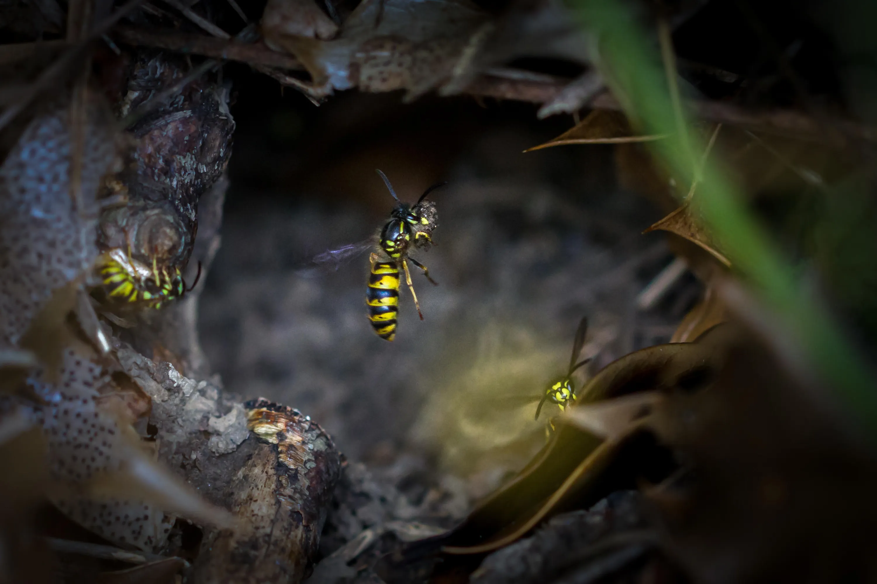 A common wasp carrying decaying wood in its jaws from this hole to its nesting site in Yorkshire. (Photo by Rebecca Cole/Alamy Stock Photo)
