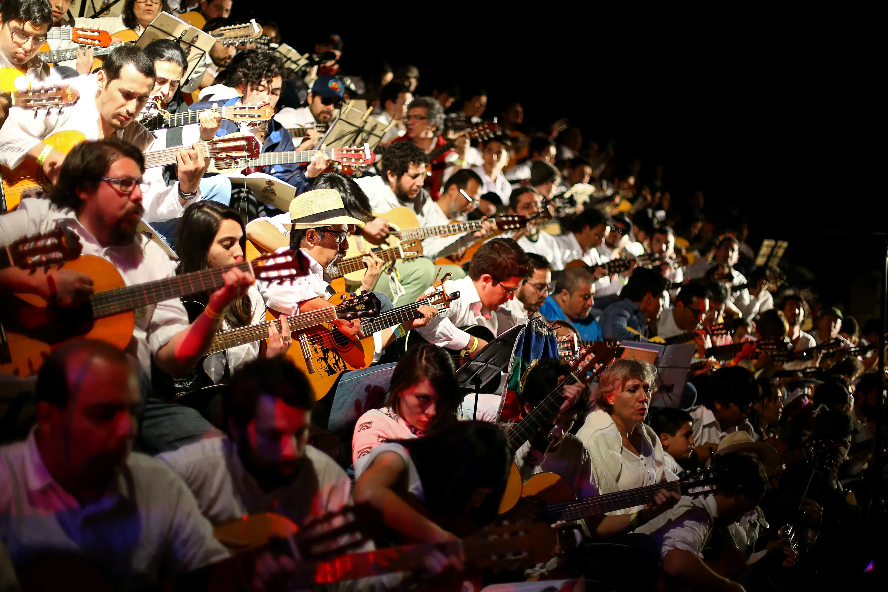 People play guitars as part of “Mil guitarras para Victor Jara” (One thousand guitars to Victor Jara) music concert in Santiago, September 24, 2016. Jara was a Chilean singer, theater director and teacher who was tortured and died shortly after the coup d'etat led by former dictator Augusto Pinochet. (Photo by Ivan Alvarado/Reuters)