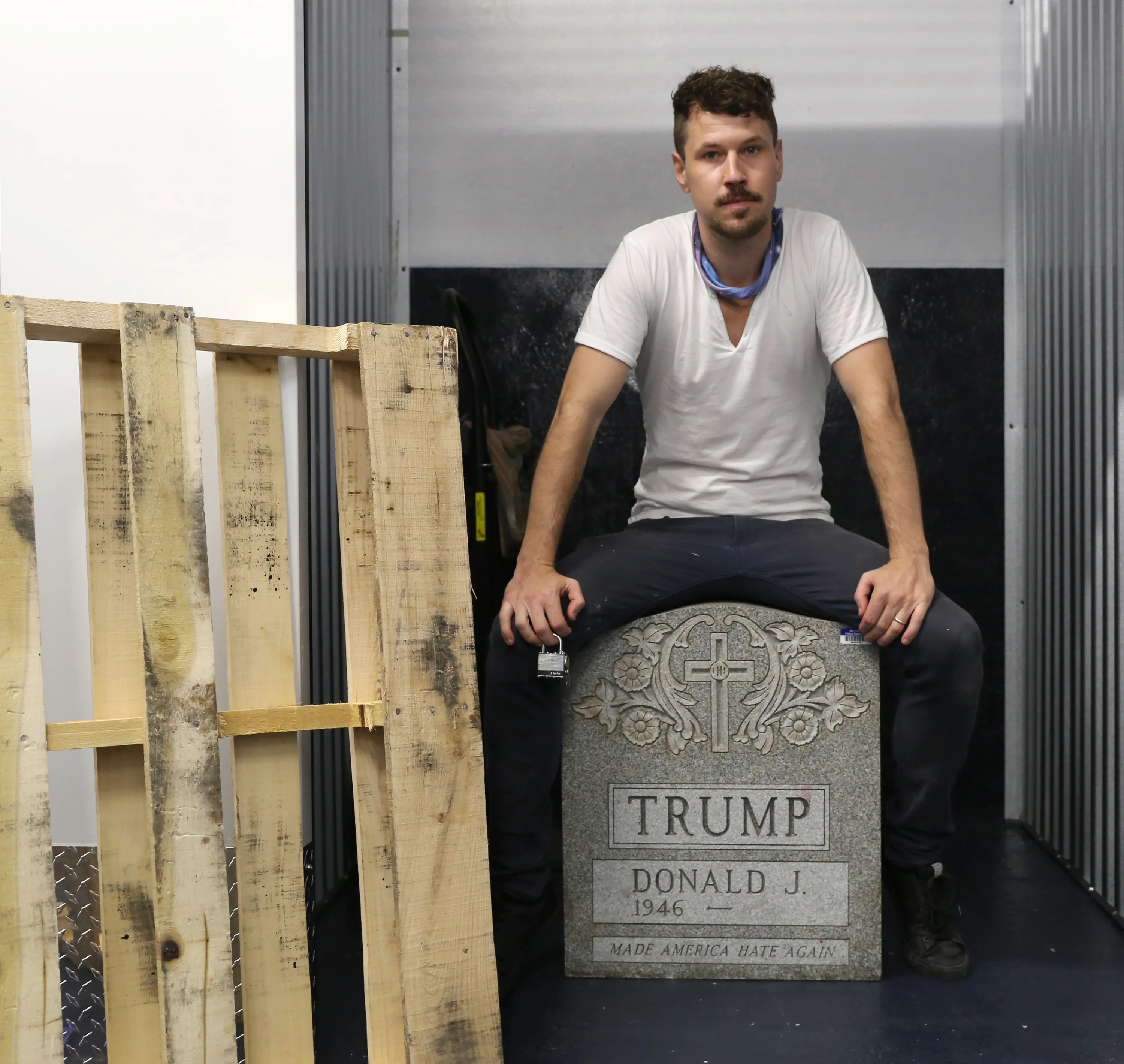 In this July 15, 2016 photo provided by Molly Krause Communications, artist Brian Andrew Whiteley sits on his sculpture, “The Trump Tombstone” bearing the name of Republican presidential candidate Donald Trump, in New York. The 500-pound slab was confiscated by the New York City Police Department after it appeared Central Park one night in the spring of 2016. The artist says the tombstone reflects “Trump's love of having his name on everything”. (Photo by Molly Krause/Molly Krause Communications via AP Photo)