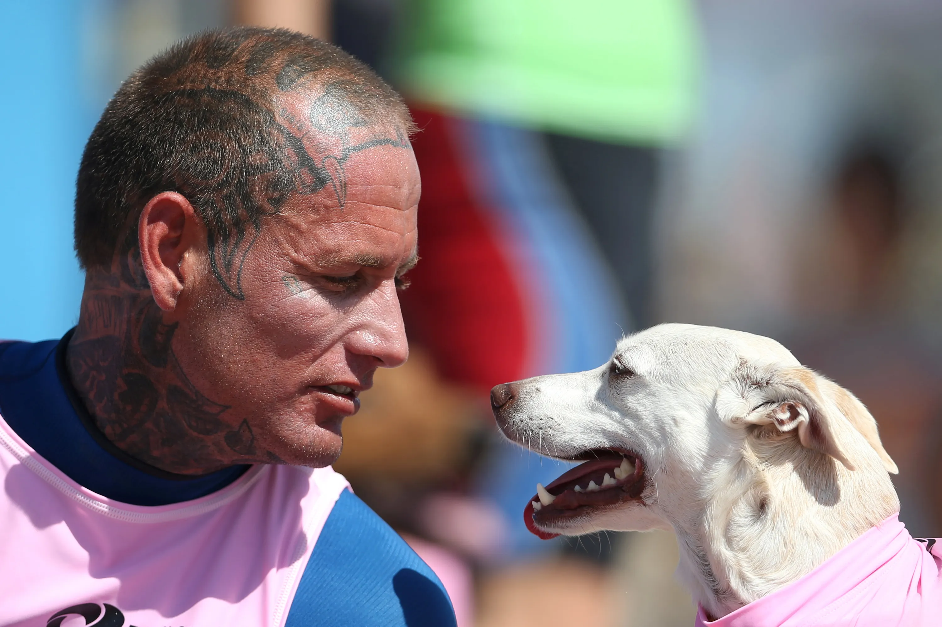 Ryan Rustan, 36, looks at his dog Sugar before it competes in Huntington Beach, California, U.S., September 25, 2016. (Photo by Lucy Nicholson/Reuters)