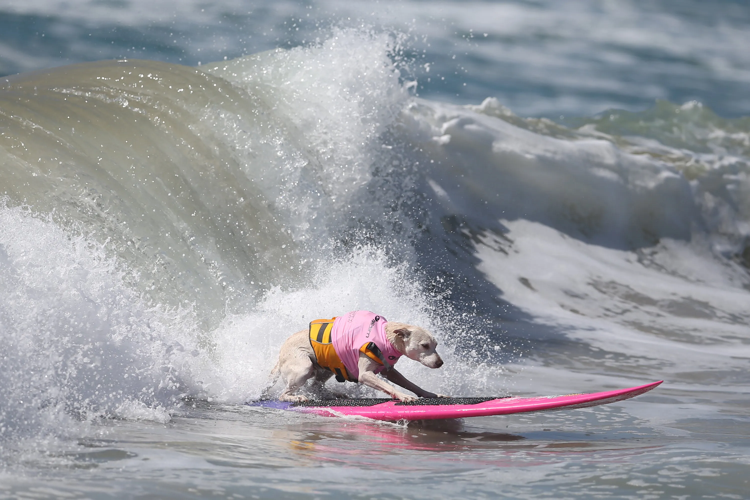 A dog rides a wave during the Surf City Surf Dog competition in Huntington Beach, California, U.S., September 25, 2016. (Photo by Lucy Nicholson/Reuters)