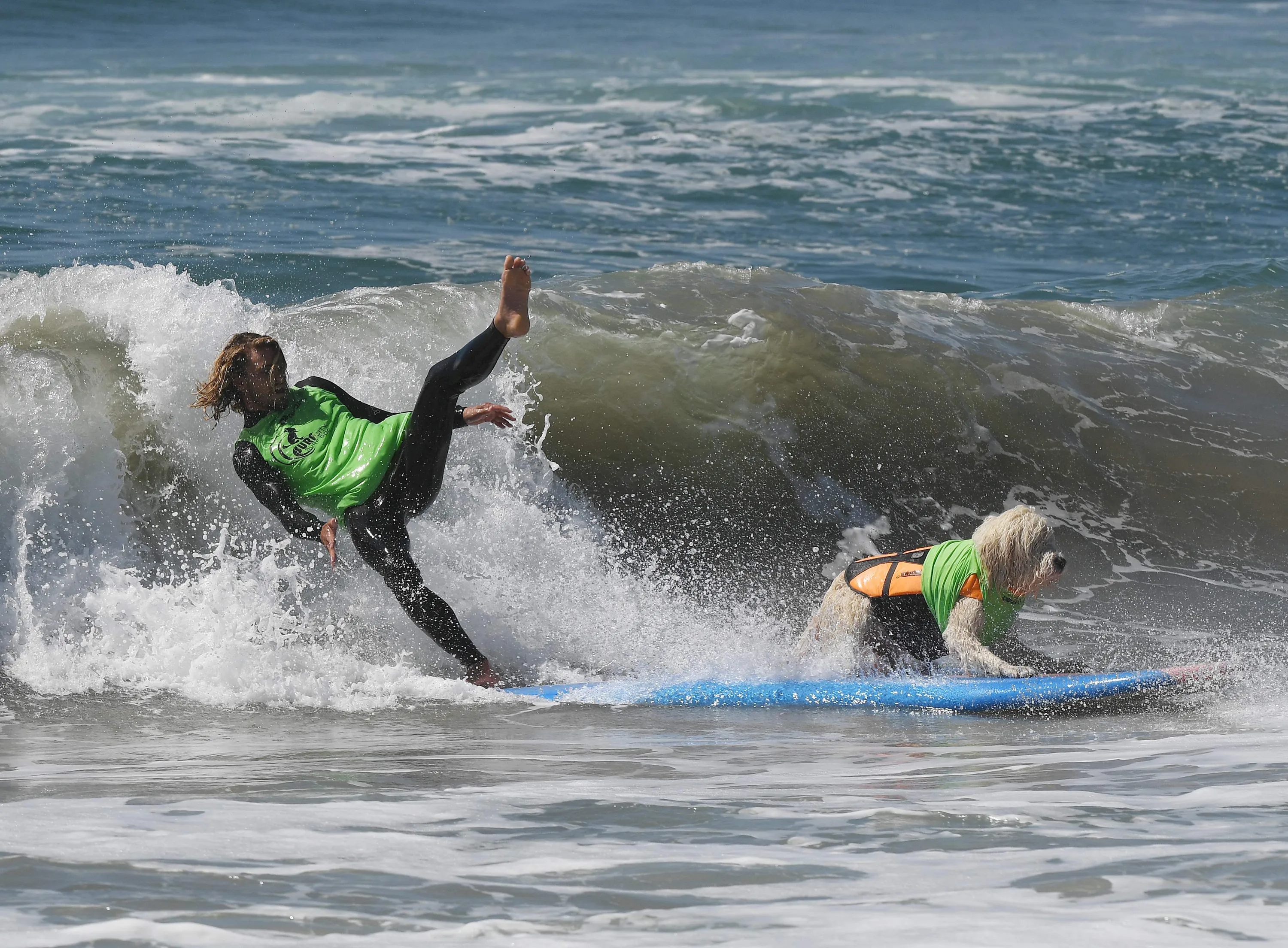 Surf dog Kona Kai the Labradoodle and owner Shaun Lucado compete in the tandem event during the 8th annual Surf City Surf Dog event at Huntington Beach, California on September 25, 2016. (Photo by Mark Ralston/AFP Photo)