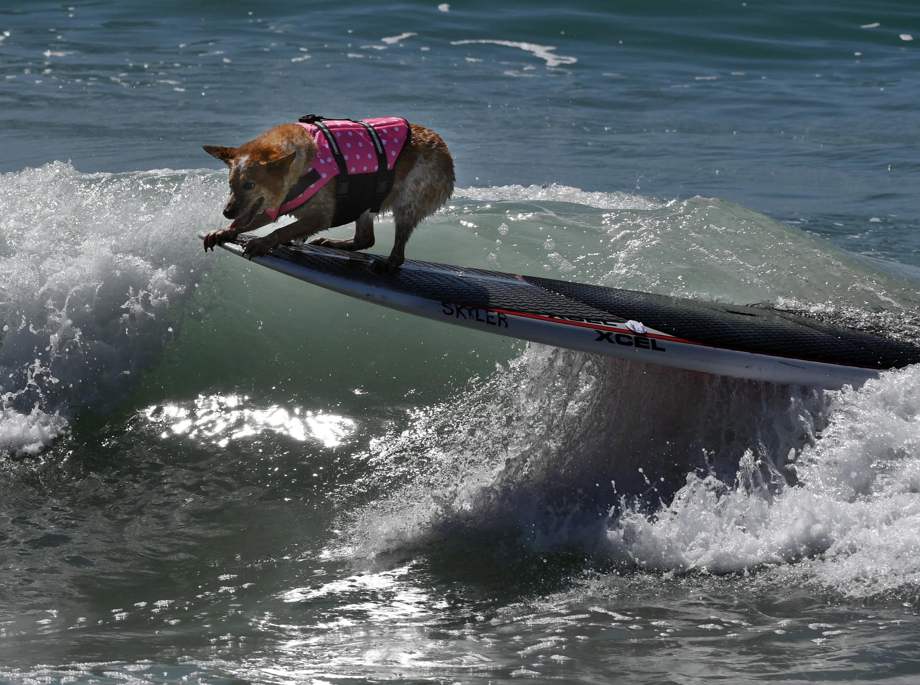 A surf dog competes in the tandem event during the 8th annual Surf City Surf Dog event at Huntington Beach, California on September 25, 2016. (Photo by Mark Ralston/AFP Photo)