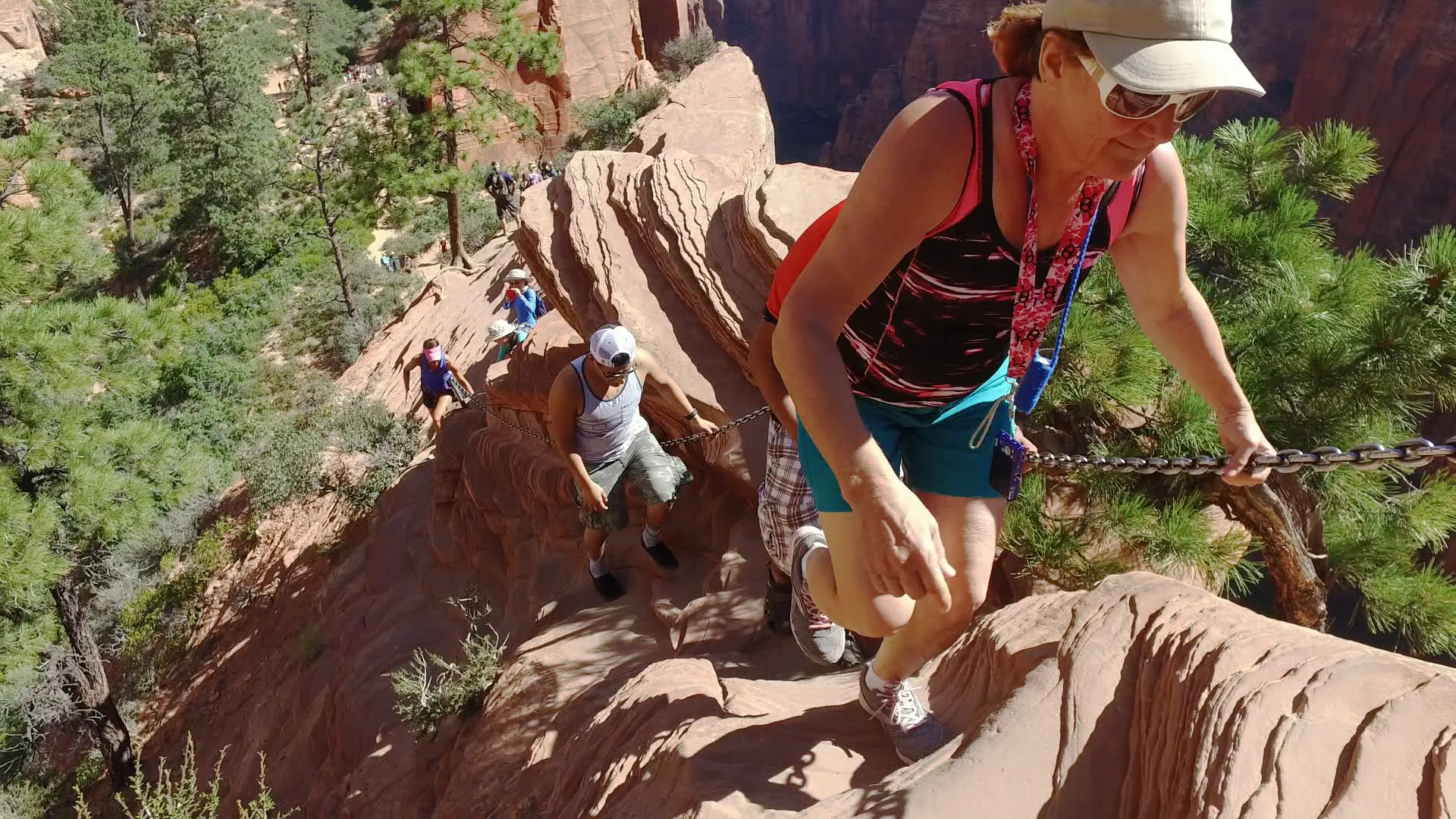 Hikers ascend Angels Landing, one of the most popular trails in Zion National Park, Utah on July 30, 2016. The 5.4 mile round-trip trail features 1,500 foot drop-offs and breathtaking views of Zion Canyon, but is not for the feint of heart, or those afraid of heights. (Photo by Jim Seida/NBC News)