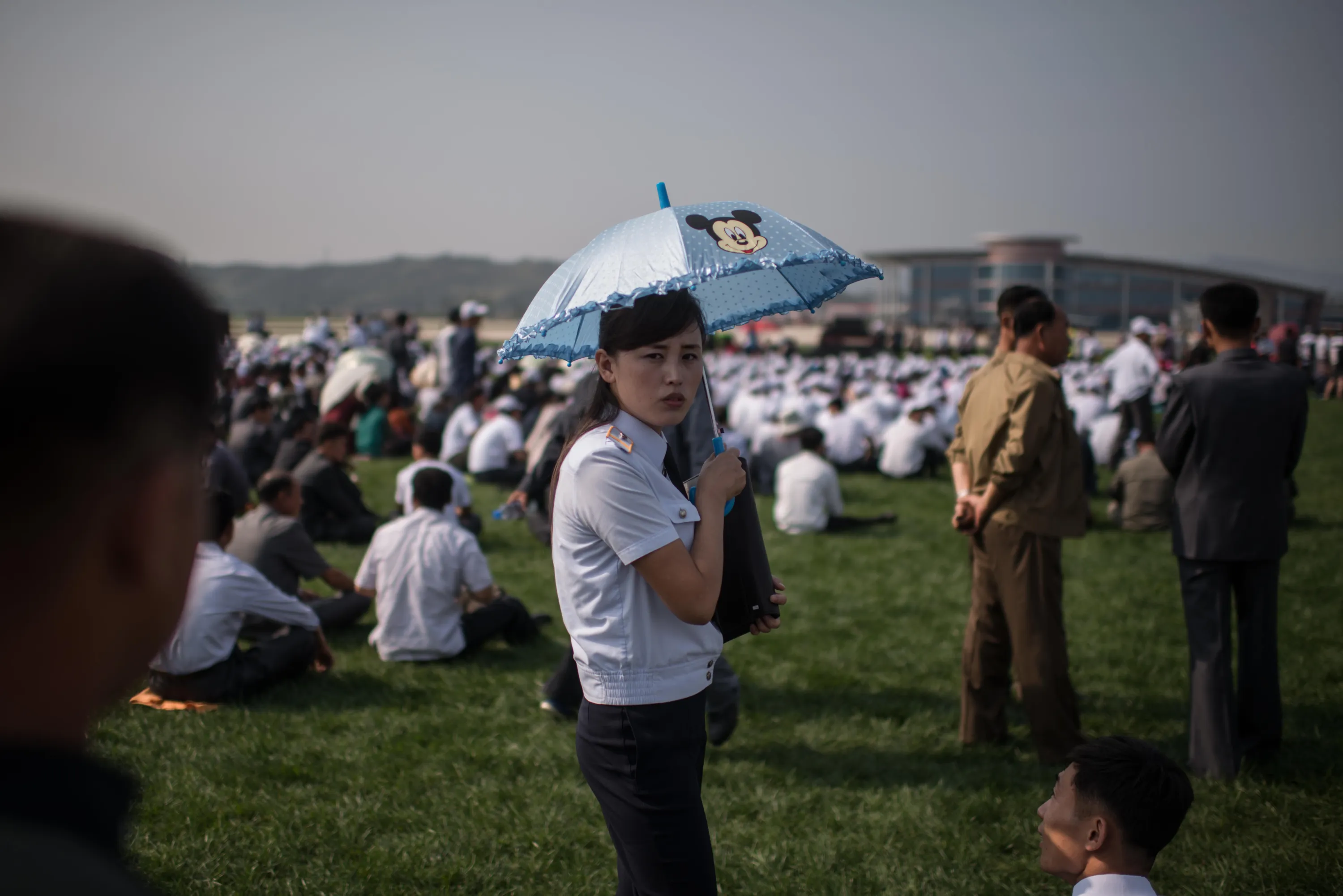 A woman holding an umbrella waits for the start of the first Wonsan Friendship Air Festival in Wonsan on September 24, 2016. (Photo by Ed Jones/AFP Photo)
