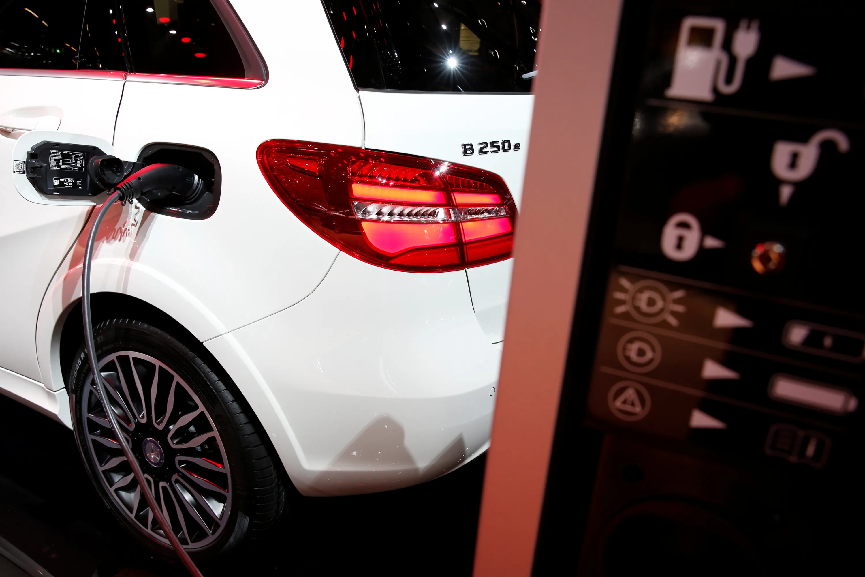 The charging plug of a fully electric Mercedes-Benz B 250 is displayed on media day at the Paris auto show, in Paris, France, September 30, 2016. (Photo by Benoit Tessier/Reuters)