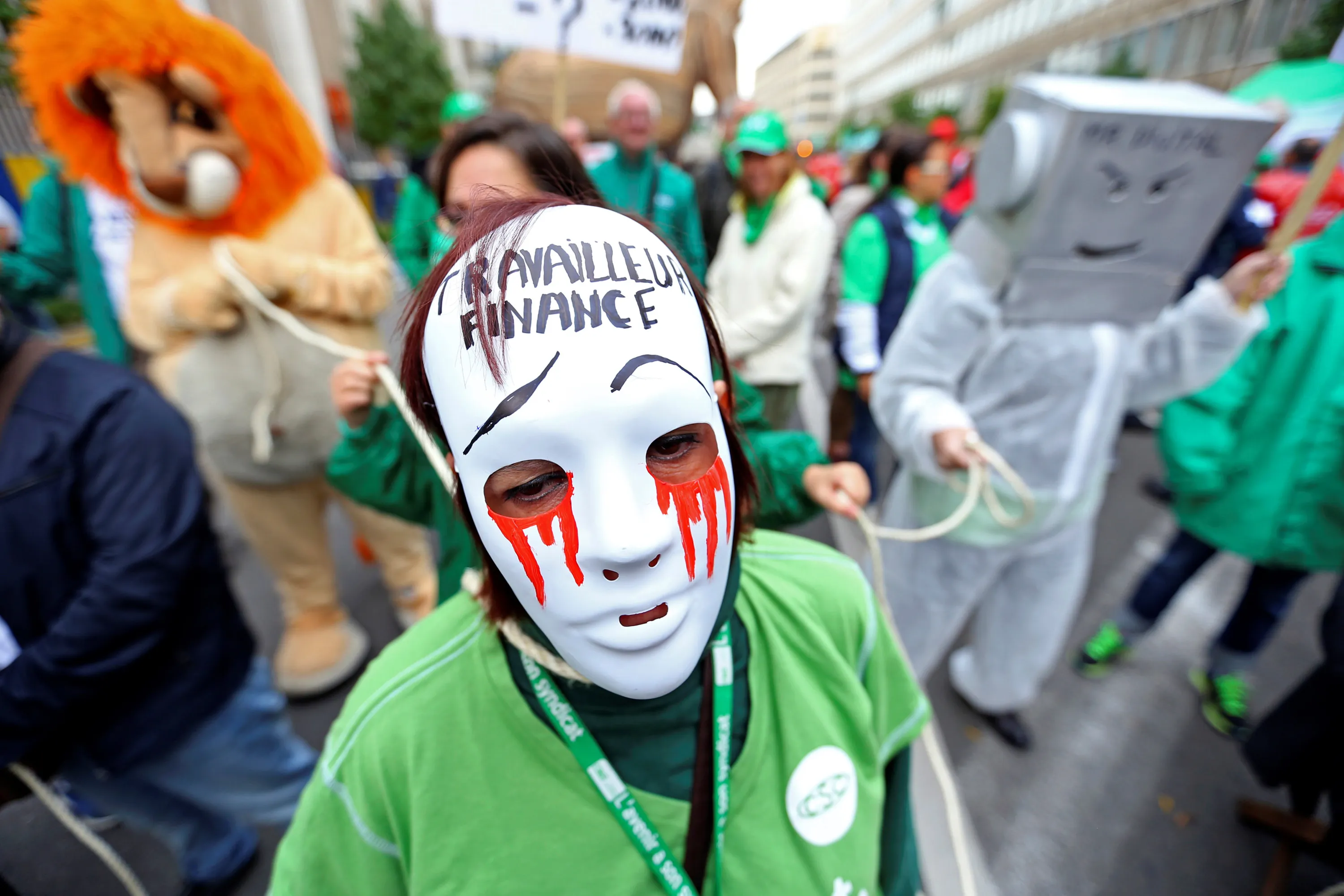A woman wears a mask during a protest over the government's reforms and cost-cutting measures in Brussels, Belgium September 29, 2016. The mask reads “Finance Ministry worker”. (Photo by Yves Herman/Reuters)