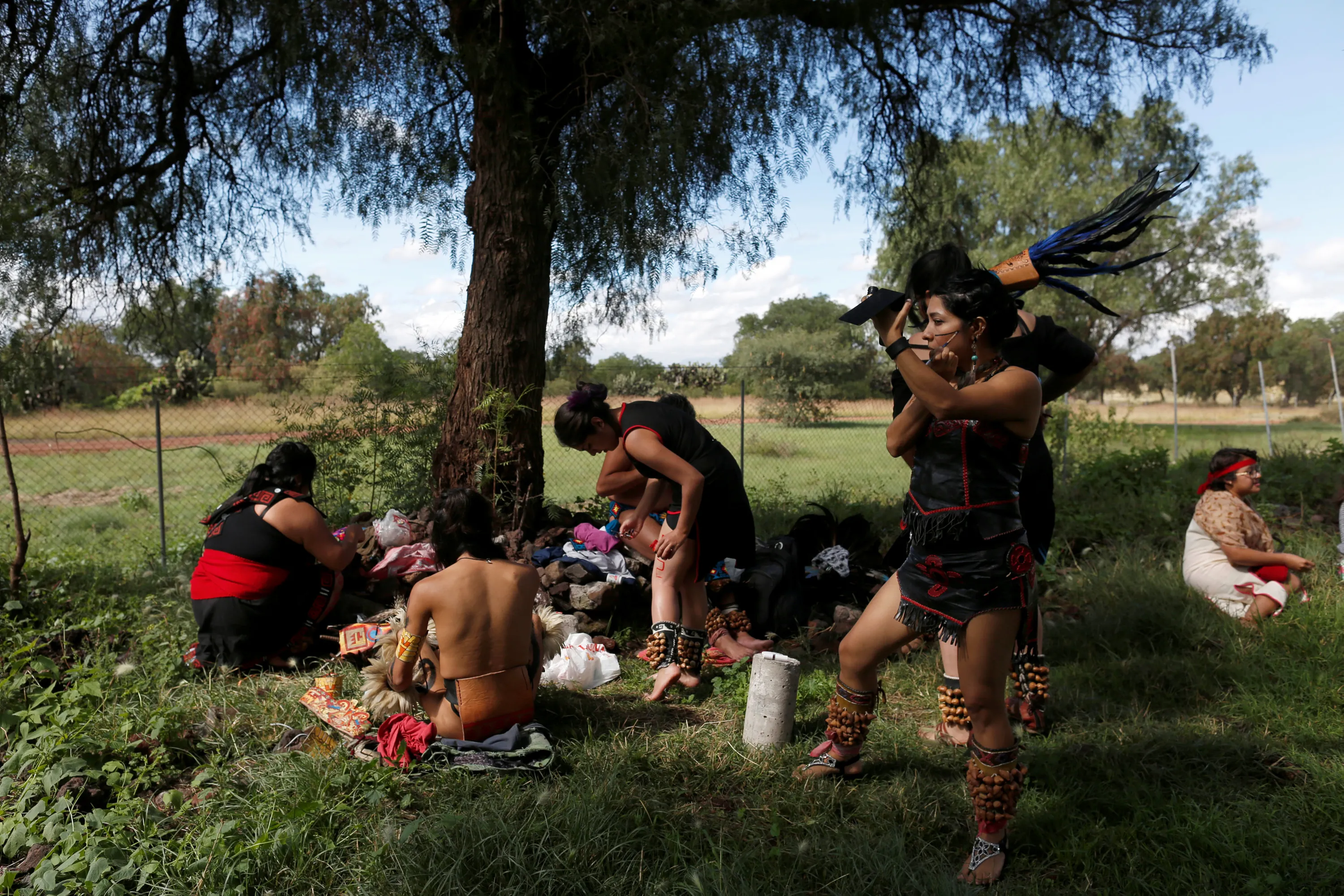 Dancers wearing pre-Hispanic themed clothing get ready before performing a ritual for corn, as they protest with Greenpeace volunteers against the growing of transgenic corn, or genetically modified corn, in the country during National Corn Day celebration at the archeological site of Teotihuacan, Mexico September 29, 2016. (Photo by Carlos Jasso/Reuters)