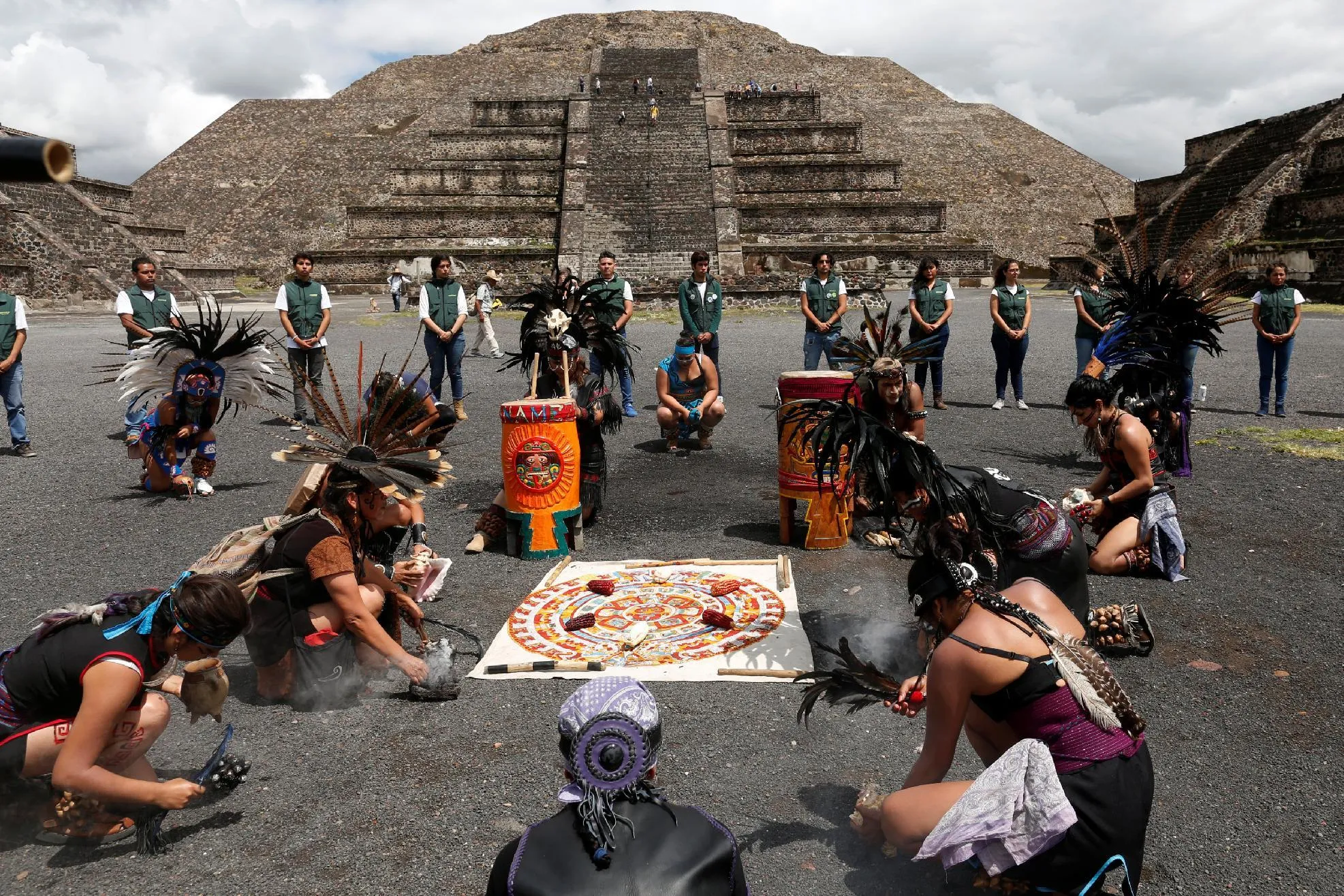 Dancers wearing pre-Hispanic themed clothing perform a ritual for corn, as they protest with Greenpeace volunteers against the growing of transgenic corn, or genetically modified corn, in the country during National Corn Day celebration at the archeological site of Teotihuacan, Mexico September 29, 2016. (Photo by Carlos Jasso/Reuters)